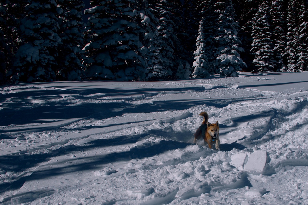 Oh, by the way, Stella is a dog. She is totally rad ski dog. I'm fostering her. She was one of those 115 sled dogs that were starving outside Hartsel when some dip shit didn't feed them for a month. 13 died, so it's pretty remarkable Stella is doing as well as she is. It's kind of amazing…for a dog who has live outdoors all her life, she is super well trained. And the coolest thing – I can skin up and she literally walks right behind me, stepping on my tails occasionally – but not getting distracted and running off. It's rad. As for coming down, she kills it. Here is a photo of her on a recent powder day. Two years old, Alaskan Husky, been through hell and loving life. Now that's a good dog for sure.