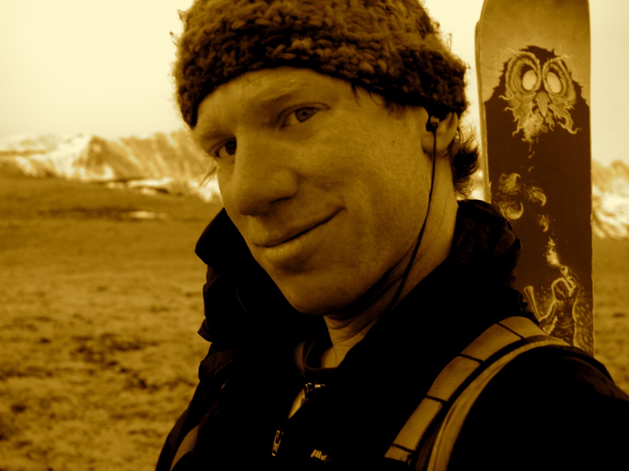 Tromping around above timberline, skis, a cool dog and an iPod. Good reason to smile.