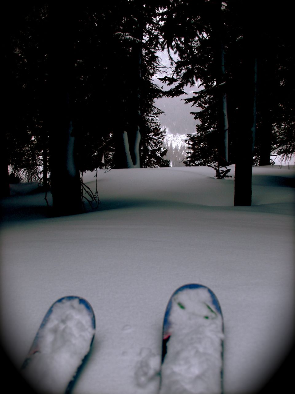 Funky conditions out there. Funky like James Brown – not bad, just different. Three to four inches of fresh, on top of a grippy surface layer, on top of the more solid layer from the three weeks of warmth we've had. Required a little bit more the point 'em and shoot technique, as too much pressure would send you arcing across the hill ala Bode Miller in a slalom race. Necessary if your going to busting the gates at Adelboden, but not so much for a little afternoon powder ski on a mellow 20° powder slope. Took a couple laps, and that was plenty, as the world seemed to be a slow motion ethereal wooded landscape. Which, indeed, it was. OK, enough waxing poetically – here's some damned photos of the day.