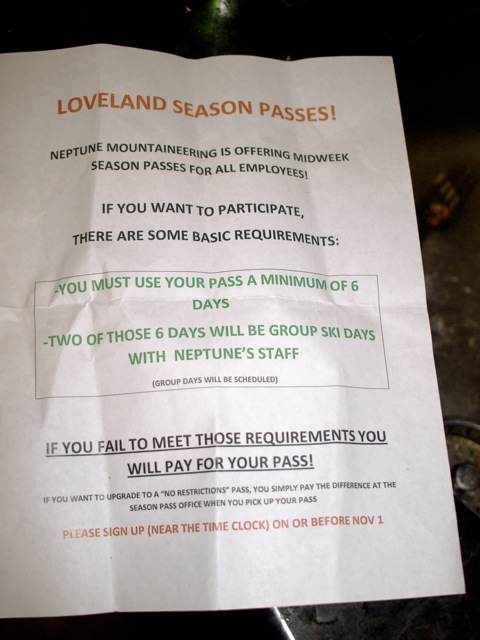 The place I work is providing free weekday ski passes at Loveland to all employees (note the somewhat comical office memo – love the parameters…you "must" ski…uh, ok, I think I can handle that. Hell of a lot better than the ones we used to get when I taught school!), so it was an easy decision to pick up an extra one for Elaine yesterday as well for cheap. It comes with three free days at Monarch and Durango and one at Silverton Mountain, That will be definitely be a nice supplement to Eldora and the backcountry, and should extend the season out another month (or more) on both ends and allow us to explore some new (for us) terrain. They are blowing snow as we speak at Loveland, and I would not be shocked if they opened next week sometime.