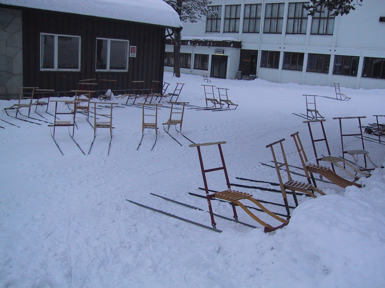 Kids in Norway would take advantage of snowy sidewalks by going to school with push sleds. Here is the view in front of a school: