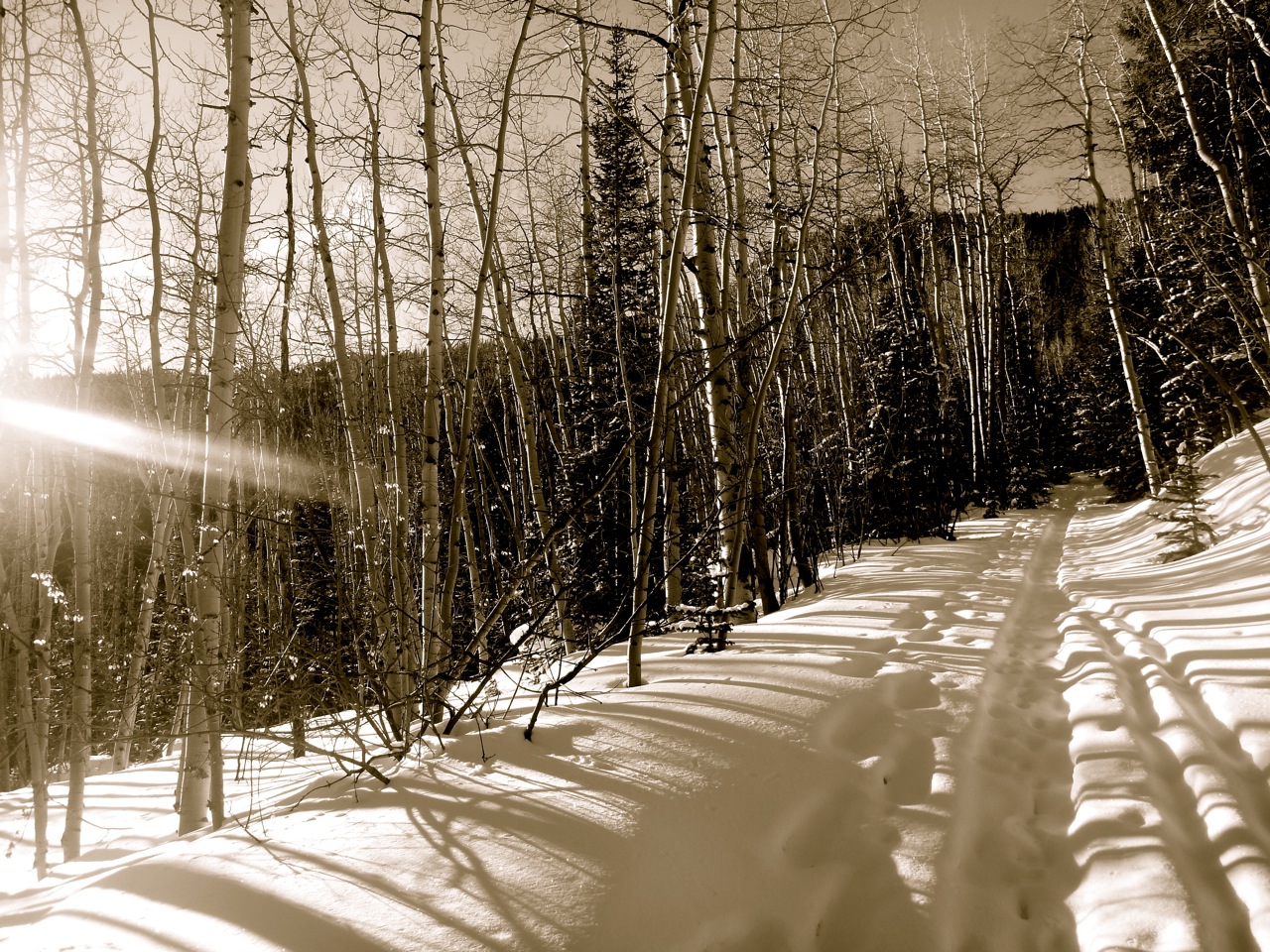 February 21. The dead of winter, but we're on the way out now. You can feel it at the place I work. The climbers are starting to come in. Spring fever is starting to hit. I don't want it yet though. I was to ski. I want to feel the stark cold of a bare aspen grove. I want to follow the tracks of coyote up a slope, winding to a peak. I want to ski behind Elaine and hear that ecstatic yelp of a perfect turn, of absolute freedom (for you can only know that feeling if you have lost it – perhaps that is part of the reason this year is so good).