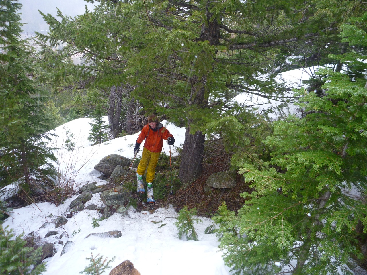 As we climbed, the rain turned to snow. Elaine's first day with ski crampons. She's a fan…they turn any pair of skins into tanks.