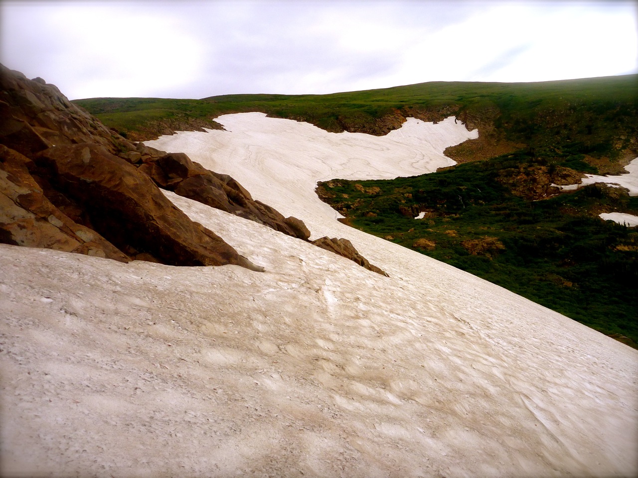 The continual quest for snow is leading to exploration. The snowfield that has been my before-work staple since early May is melting out quickly, so I'm trying to find another option. Into a land I've never been before, through dense pine forests and a trail that I dare-say hasn't seen a footprint in five years. Different flowers from others on the tundra.