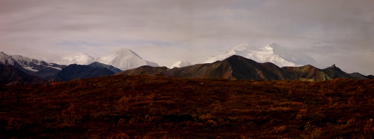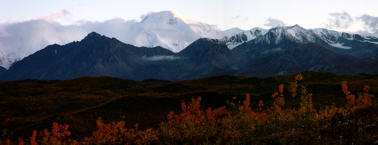 Mount Mather on left, Mt. McKinley on right. McKinley is actually a double summit. The peak on the far right is the North Summit, which is 19,000 some-odd feet tall. The higher peak is the South Peak, which looks more rounded, but is 20,230 feet tall. Highest point on the North American continent. I would be interested in skiing this mountain someday.