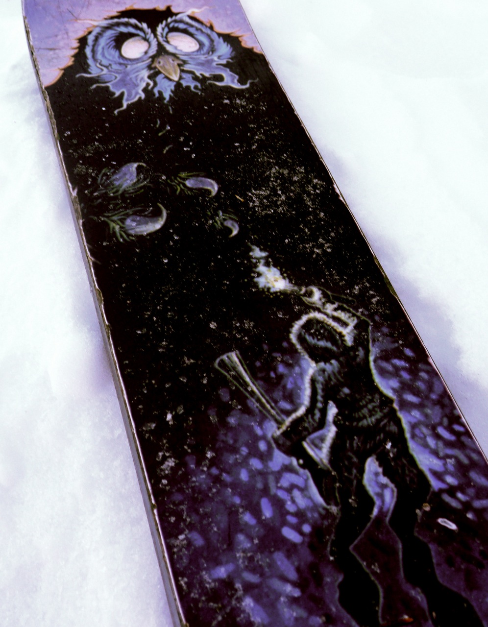 Sometimes on a long uphill I'll look at this graphic on my ski and find inspiration. Emerging from the underground, searching for something. The owl is a symbol of wisdom. I'm not sure there is much wisdom in going out on a minus-20° day with a 30 mile per hour wind, but make no mistake about it, every ski is a search.