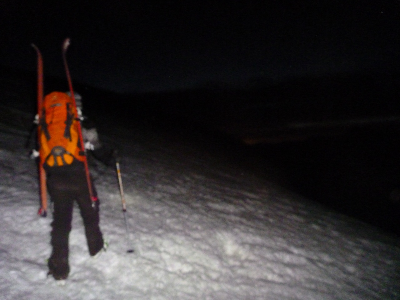 As the night wore on, everything became more and more surreal. I found myself stumbling forward because forward was a direction I could understand. My skis sliding in front of me often doubled, my vision blurred. I found I thought I was wasting energy trying to keep my eyes focused, and ended up doing most of the skiing accepting that I just plain was not going to be seeing anything.