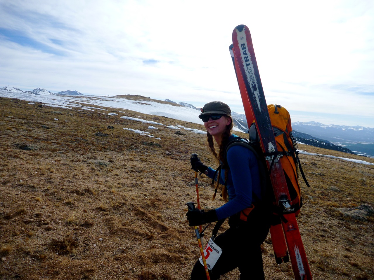 I entered a world of exercise-induced nausea, fatigue, and grumpiness as the climb up Taylor’s Pass seemed to go on and on and on. And on and on and on. As the race had originally started as more of a nordic race, most of the climbs are gradual and slow, with Taylor Pass being the second worst of them all. When we finally reached Taylor Pass, we found Aspen ski patrol at the top, asking us how we were doing, and offering encouragement.  They directed us to the top of a peak, which required hiking up because there was no snow, and then, they said, we could ski the rest of the course. They told us it was 4.5 miles to Barnard Hut, another cut-off point, and then 7 to the top of Aspen. The 4.5 miles to Barnard Hut was enough to make Dan and I want to scream. Slight uphills, requiring skins, as it was too warm to wax, and slight downhills during which we got little to no rest, as it was a jumbled mess of ice, dirt and who-knows-what.
