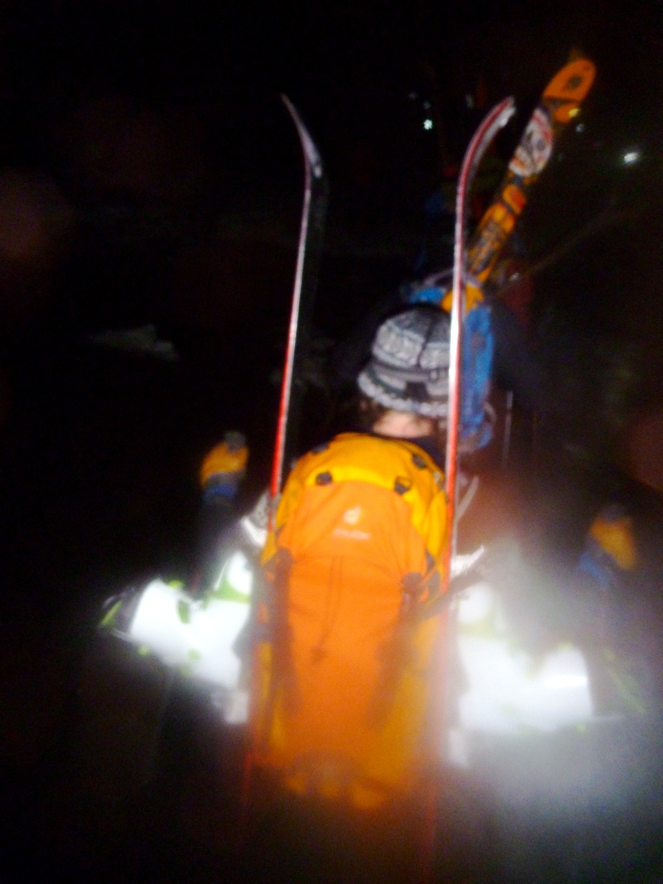 The dark was disorienting, with what seemed like hundreds of headlamps bobbing through the dark. Then, I looked up and saw the outline of one of the racers taking his ski and throwing it, cussing.