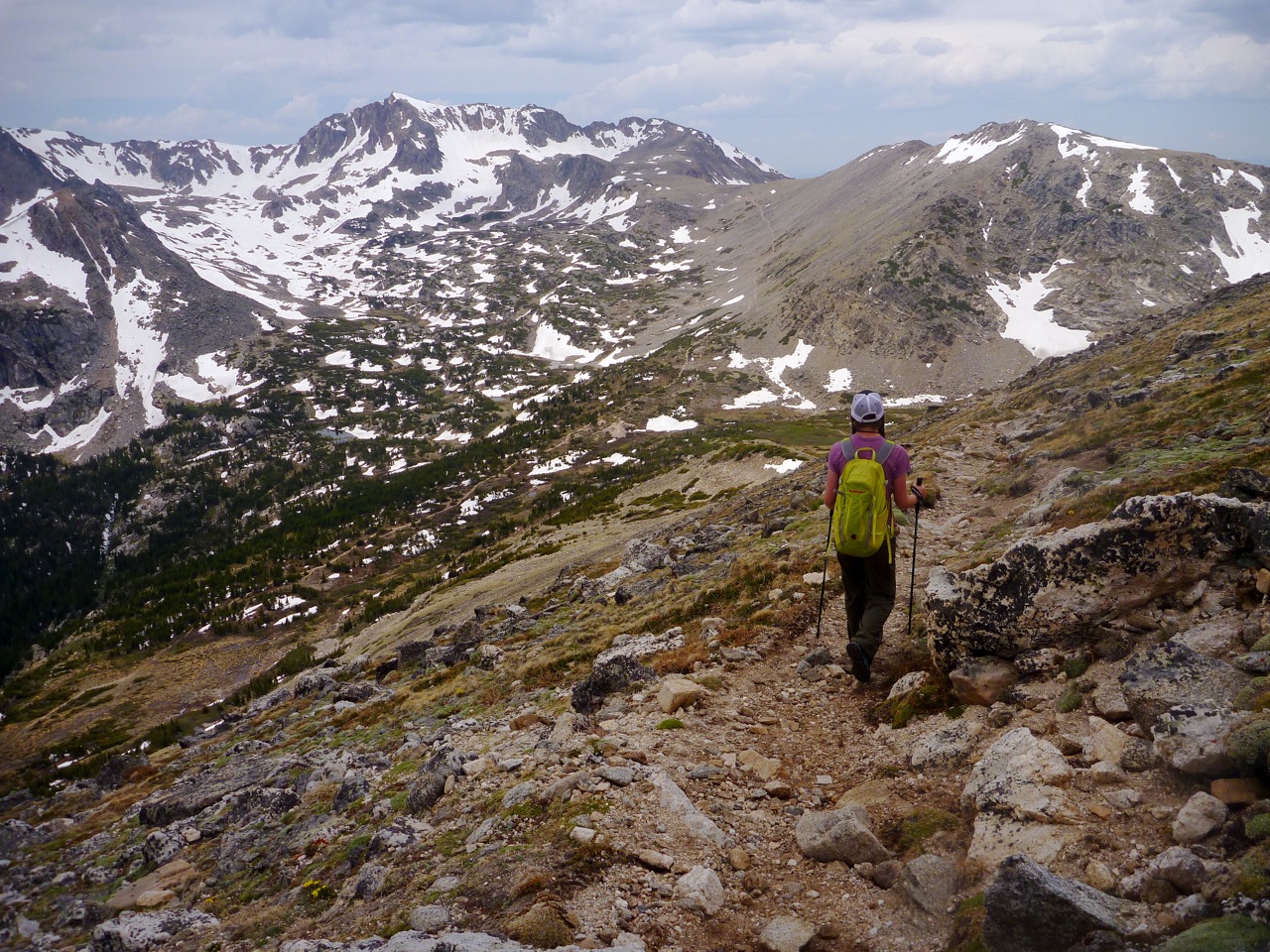Heading back down. The Arapaho Pass trail cuts up the saddle in the middle. This is an extemely popular hike. We really do live in a mecca for hiking and backpacking.