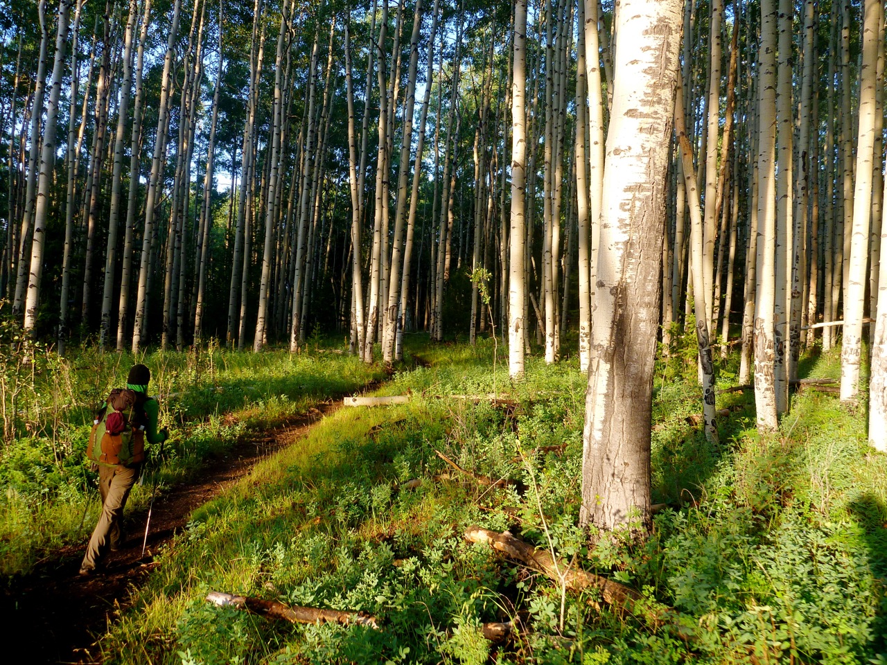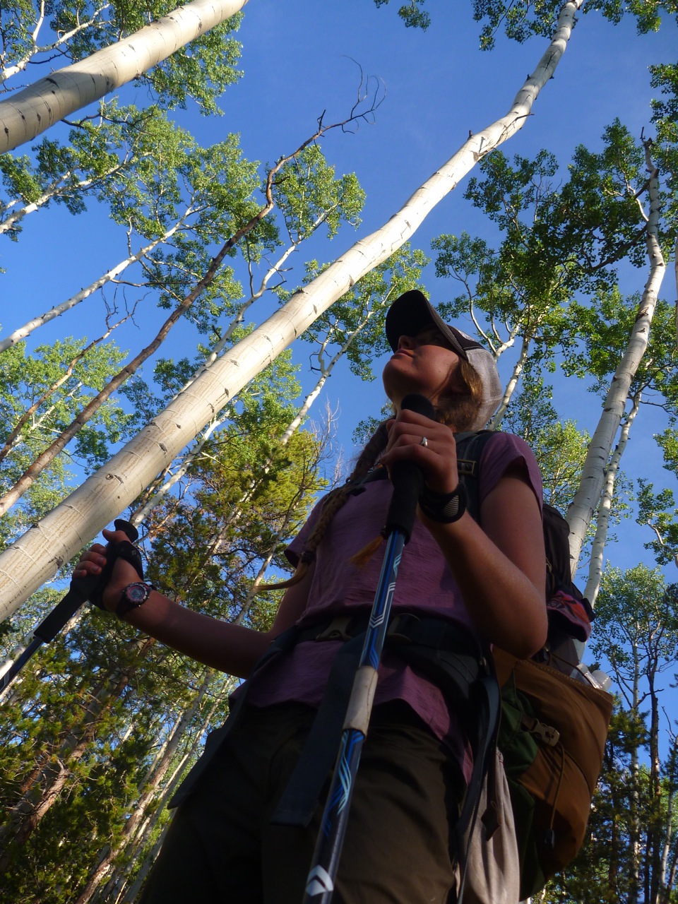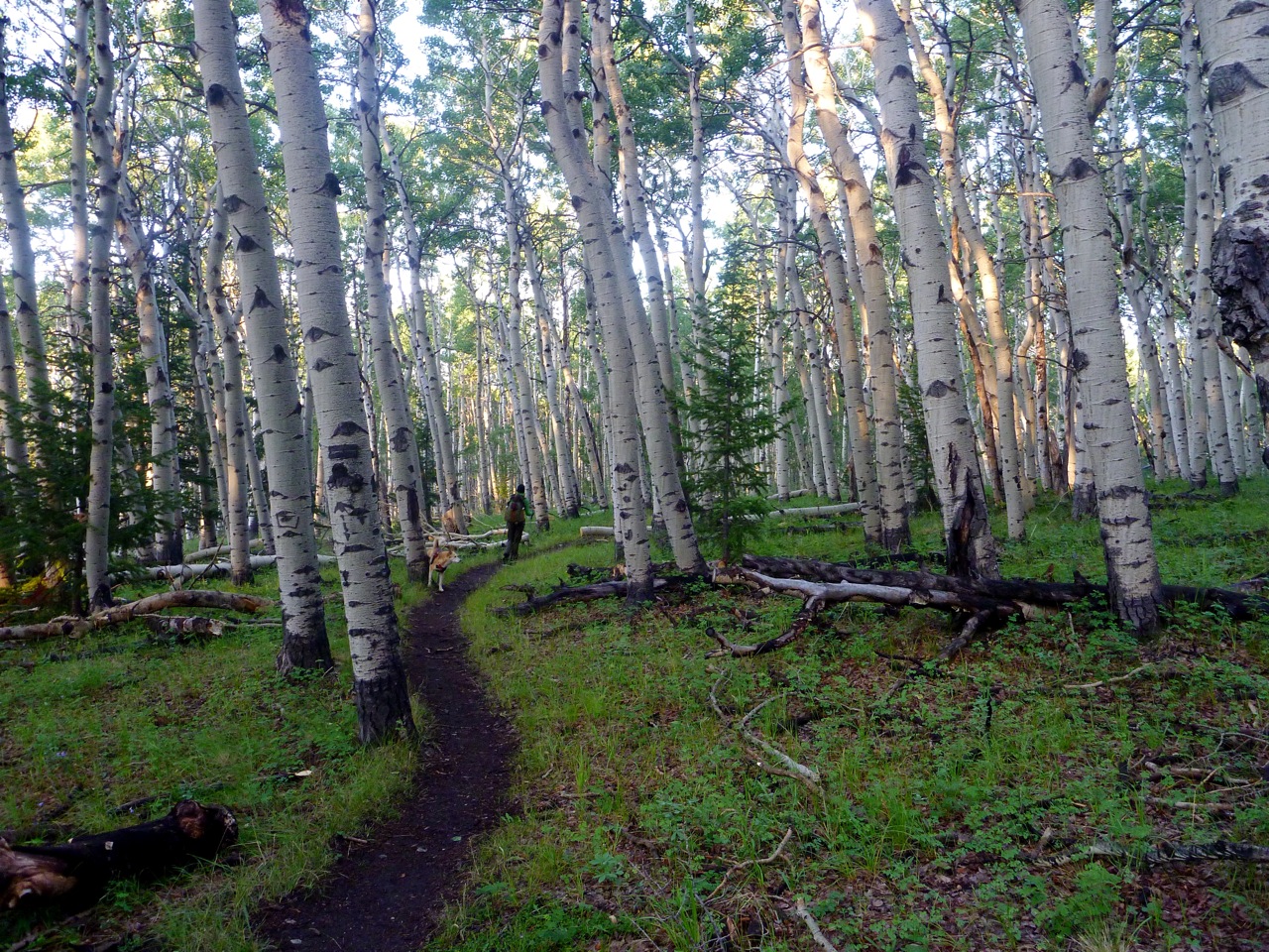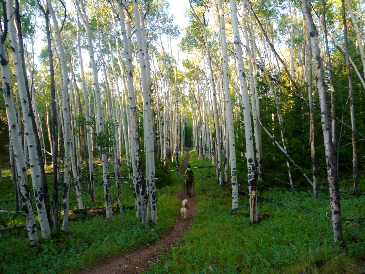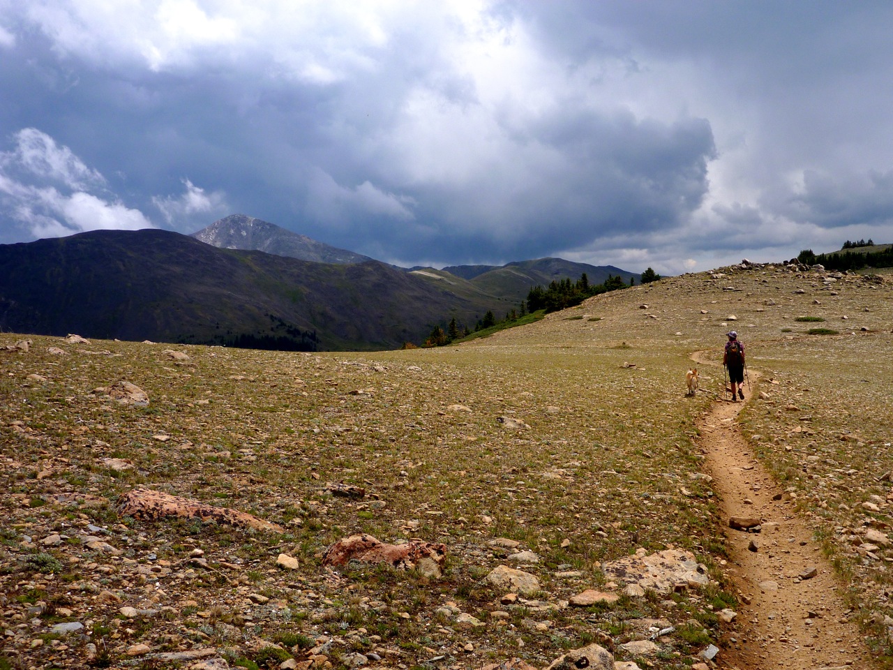 The route continued through pine and aspen forests, fields with flowers and rippling creeks. We passed a guy who lost his two dogs on his day hike. We eventually saw his dogs further up the trail, running around all crazy-like while he was calling at the top of his lungs. It was a real gong show to be honest and left a sour taste in my mouth. We're pretty lucky Stella sticks so close by and doesn't pay wildlife, other dogs or people a second notice. Heck, a squirrel could run three inches in front of her nose and she's just like, ah, whatever. She's no wimp – she was part of a sled dog team in her previous life and is missing one of her fang teeth, I'm assuming from a fight. On the rare occassions when she has been charged by overly-ambitious dogs she – with almost scary efficiency – has them on their back whimpering as she pins them. Yet she never bites them. I've seen her pull this trick with dogs twice her size. The conflict is over, without exception, in about two seconds time. Yet she never shows any aggression towards another dog unless seriously provoked. In regards to wildlife, she ignores deer, moose, coyotes, elk, rabbits, marmots, squirrels…you name it. She simply doesn't care. It's a real luxury for us on the trail.