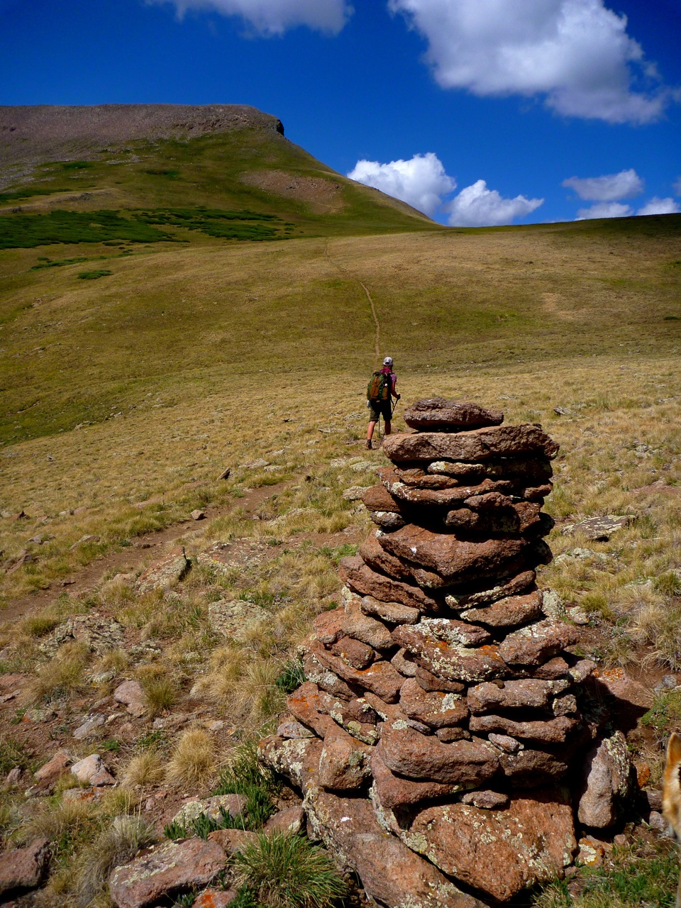 This section of the trail is a mish mash of trails, jeep roads and no trail at all, simply cairns on the tundra. We're not in Boulder anymore, evidenced by the "Kill Nancy Pelosi" inscription on the trailhead bathroom wall. Pelosi is a California congressional representative who fights hard to designate areas Wilderness, and is always getting involved in environmental issues. Alas, Wilderness is a hot button item in the west, not so much because of mining or forestry, but because it closes areas to motorized use. Personally, I'd choose to designate the whole country Wilderness and have everybody hike and live out of tents (slight exaggeration, but not by much), but not everybody shares my view. Indeed, we're in a part of the country where many don't share that view.
