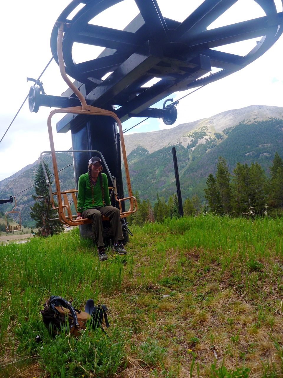 We headed straight up the ski slope back onto the Colorado Trail. We passed a ski lift, so I had Elaine sit on a chairlift while I snapped a photo. It seems like this trail does a nice job showing not only the beauty of our state, but also bits and pieces of Colorado history.