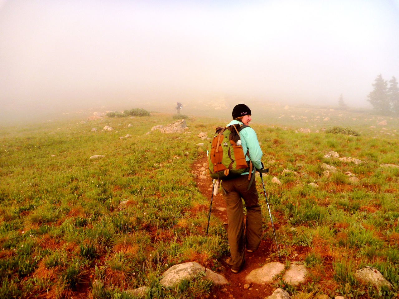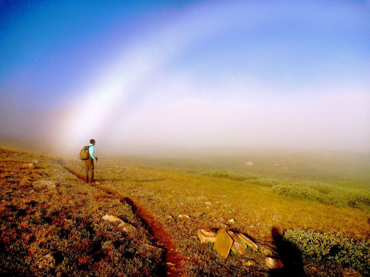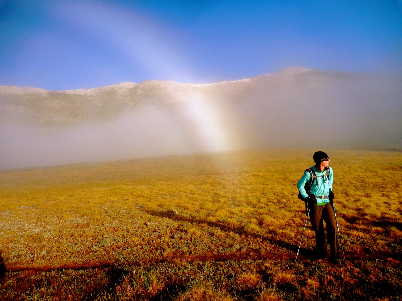 Early in the morning we passed an old man – probably 70 or so – with a huge frame pack, clad in a thick down coat. He looked as happy as a Ptarmagin on the tundra. He was on a much looser schedule than us and had seen much – beavers, moose, bear. Higher up we passed a girl from Georgia who was amazed by the mist and the "white rainbow." As I mentioned earlier, there are a lot of southern folk on this trip. Nothing wrong with that, but it would be great if more Coloradoans would experience it. It sometimes seems like the locals are so into things like mountain biking and hiking 14ers and skiing and such that we have forgotten the simple act of strapping on a pack and going for a long, long hike. I suppose it's not as sexy, and there are no Red Bull commercials for hiking, but you see so much.