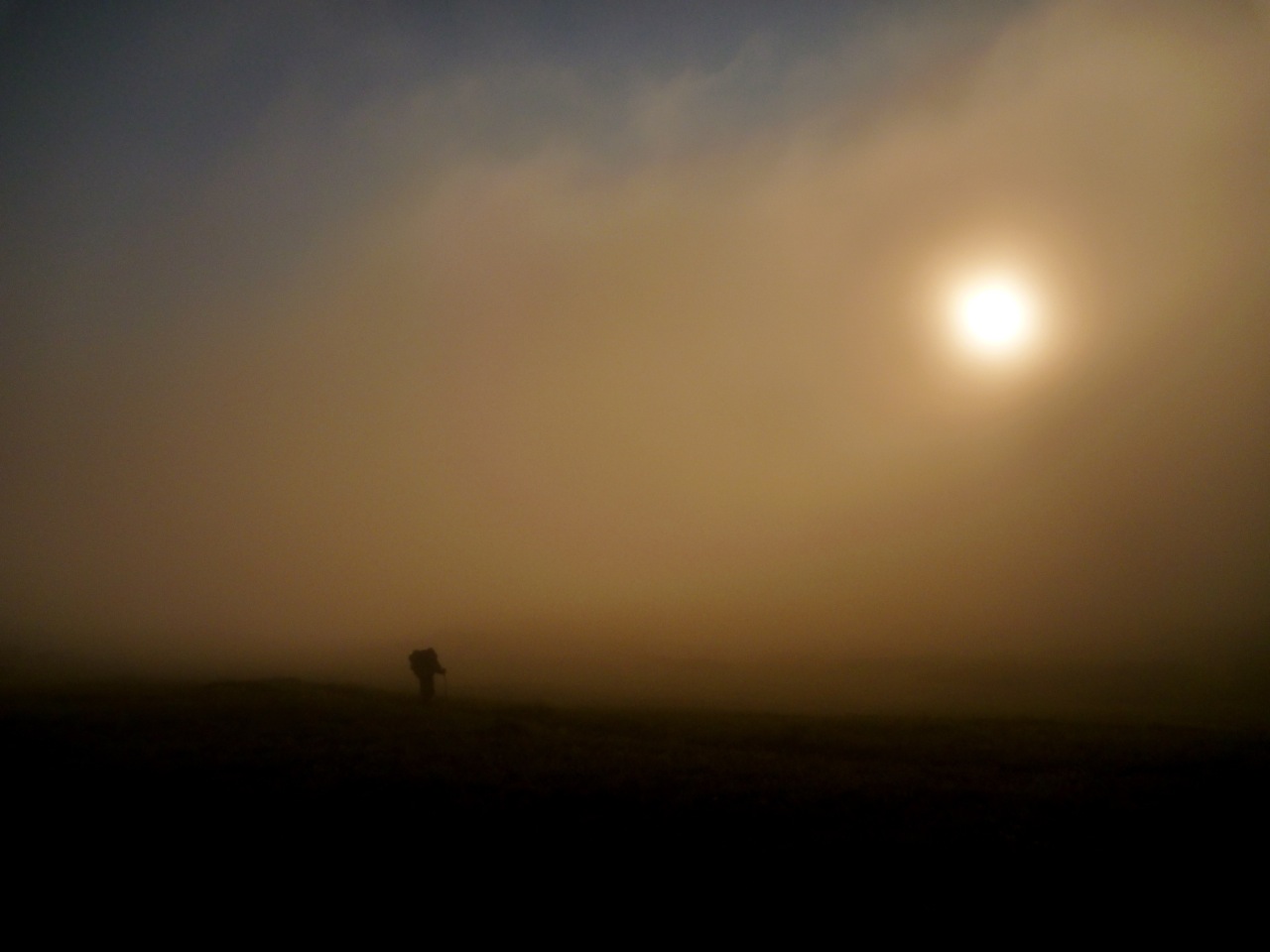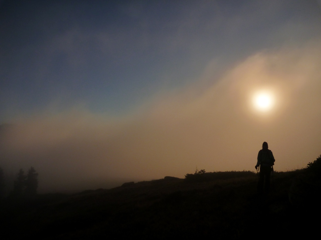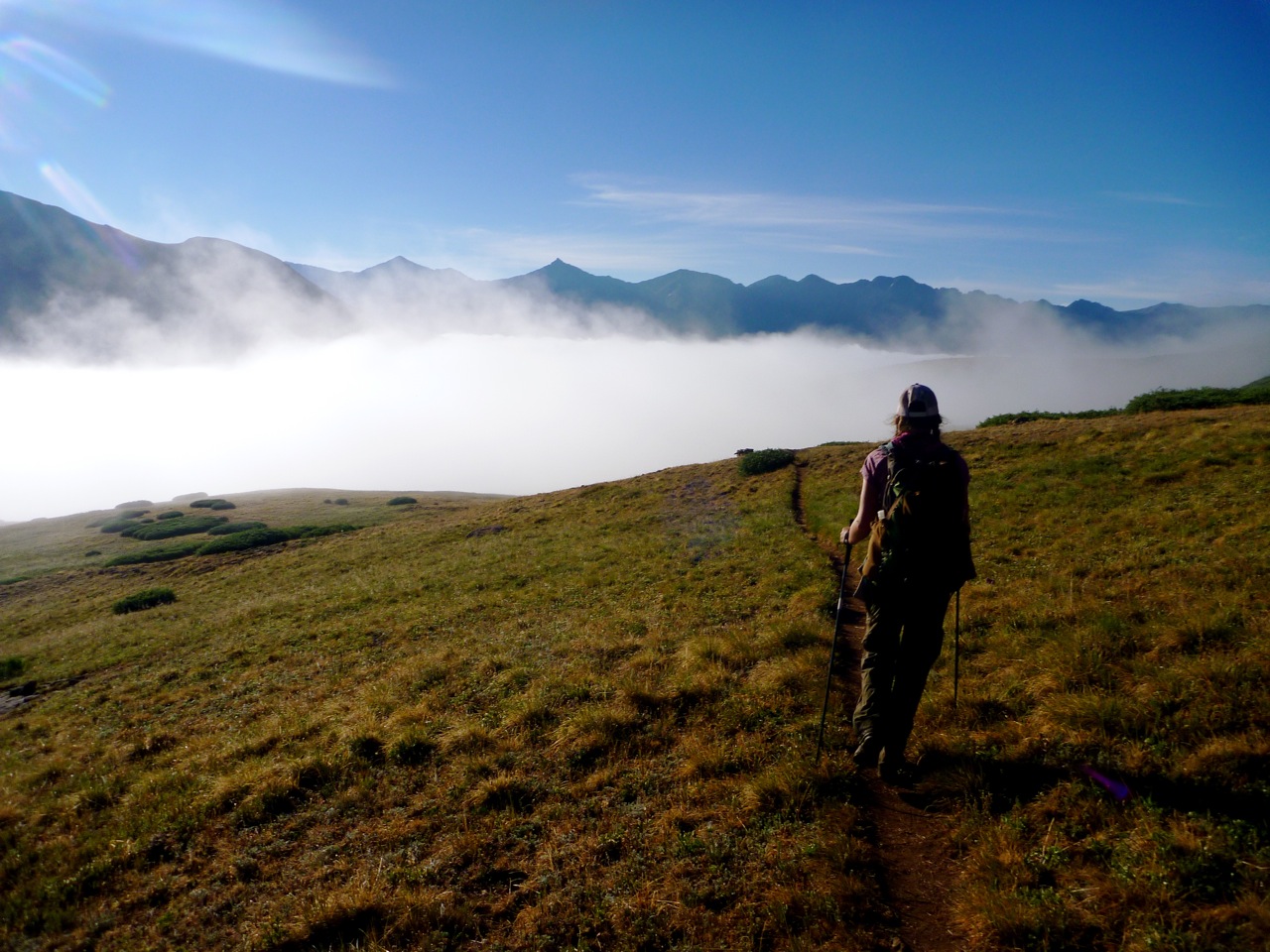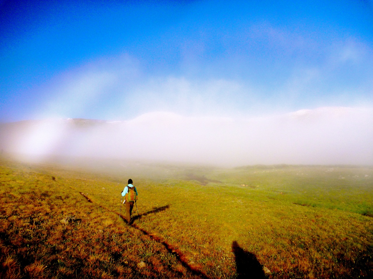 Early in the morning we passed an old man – probably 70 or so – with a huge frame pack, clad in a thick down coat. He looked as happy as a Ptarmagin on the tundra. He was on a much looser schedule than us and had seen much – beavers, moose, bear. Higher up we passed a girl from Georgia who was amazed by the mist and the "white rainbow." As I mentioned earlier, there are a lot of southern folk on this trip. Nothing wrong with that, but it would be great if more Coloradoans would experience it. It sometimes seems like the locals are so into things like mountain biking and hiking 14ers and skiing and such that we have forgotten the simple act of strapping on a pack and going for a long, long hike. I suppose it's not as sexy, and there are no Red Bull commercials for hiking, but you see so much.