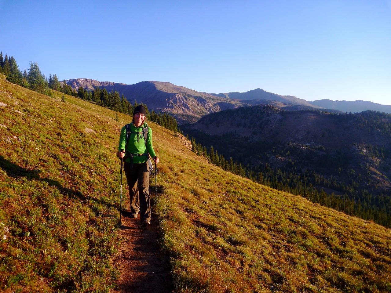 We hit the trail a shade after 6 am. The trail broke out of the woods into a wide open mountainside, where we were greeted by the dramatic site of two majestic elk spriting straight down the hill in the dawn light. They are, in every way, superior moving creatures to ourselves. We descended a gradual trail for a long while, which made for an easy start to the day. We were passed in the opposite direction by a handful of runners from the Leadville Trail Runners association, starting the day off the way I like best…moving quickly through the mountains as the sun rises. Be it on foot, bike or skis, this is the best way I have found to start the day, a better pick-me up than coffee, better for the soul than church, better for the body than a gym and better for the mind than an Ivy League college degree.