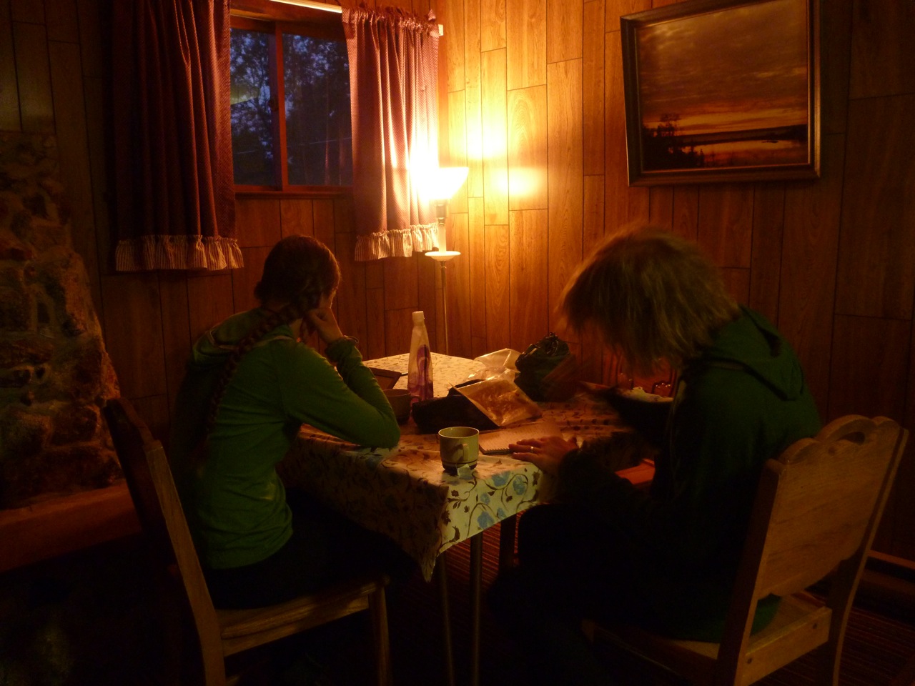 While Elaine iced her knee and worked on her feet, I headed back to the general store, picked up some burger patties and ice cream, and we cooked up a feast. We organized our packs for the next three days, showered and enjoyed the evening reading and writing around the dinner table. We don't have a dinner table at home, so this space was nice luxury. Another thing I think I'd like in my future home – a table where family can convene, talk about things, laugh, play games, read, write, lay out maps and plan epic adventures. We will not have a T.V., but we will have a communal space where open discussion can happen and dreams can emerge.