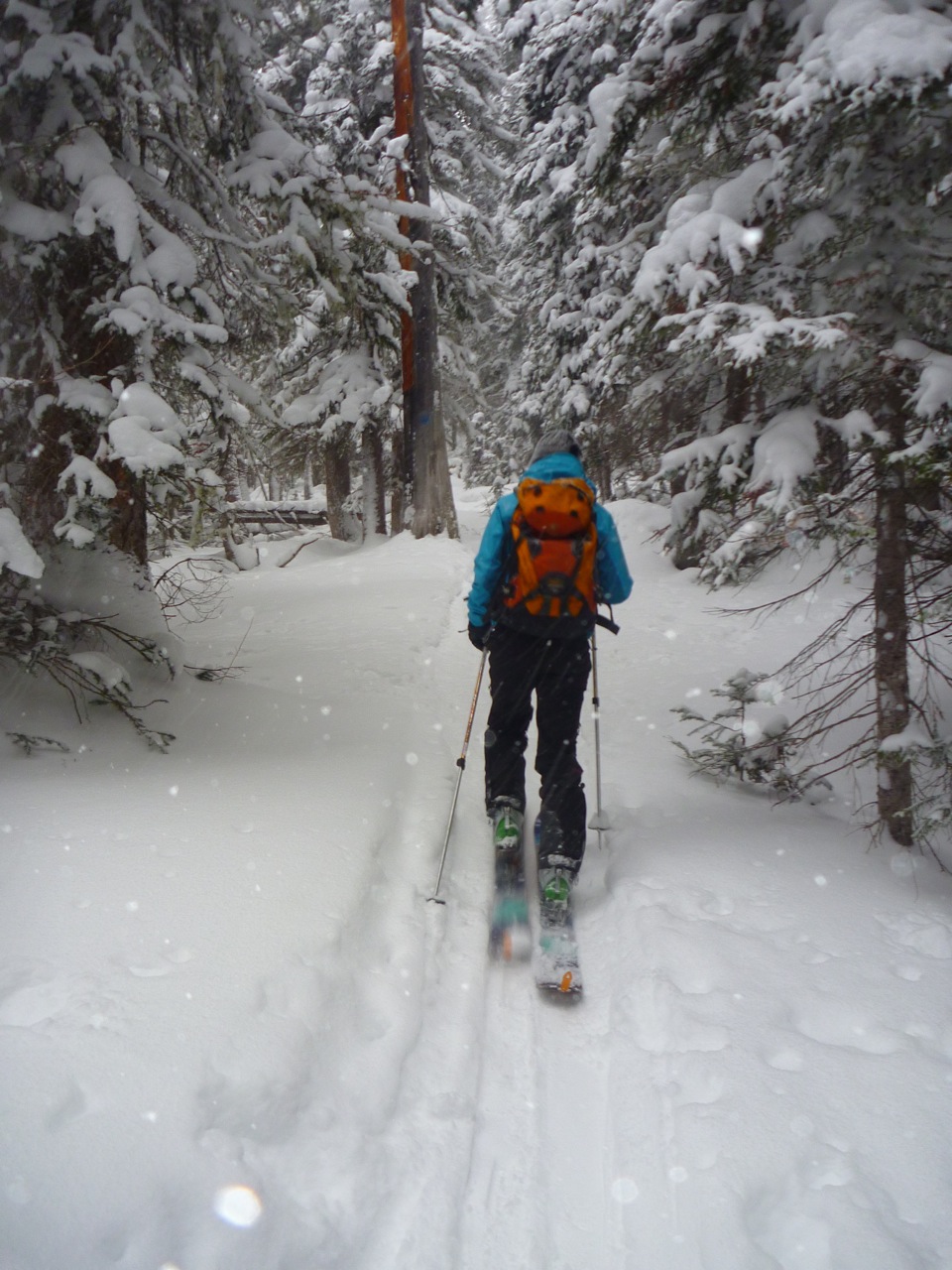 We were feeling pretty excited, because, even though the lower part of the trail was pretty rocky, the part we were on now felt like it had an amazing base (I hadn’t hit a rock in a while!), and there was a good two feet of powder on top of it. Our gung-ho attitude got us all the way to what we could tell through the howling white out was a basin, but besides that, we couldn’t tell much else. I’m guessing we were very close, if not on top of Roger’s Pass Lake, but definitely not at Heart Lake, as the little rise you hump yourself over at the end is very distinctive.