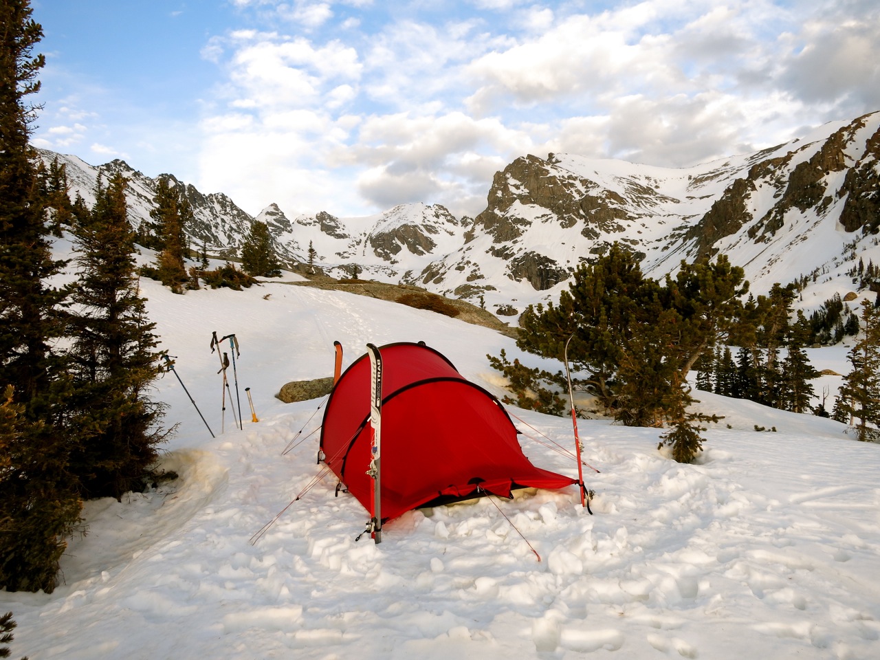 Eventually, we decide we shall go mad if we stay in the tent much longer, and so wrangle ourselves up and out. Groggy from lack of sleep, we begin to ready ourselves. Both of us feel like dog, but we say nothing to the other of it. We laugh and joke, smothering ourselves in sunscreen. (In my case, only the exposed bits, meaning my arms are completely neglected.) Finally, we set out. Our mission today? Pawnee Peak, 12,943’, which we attempted to ski last year, but got shut out because of a late start. (Ouch. We must learn.)