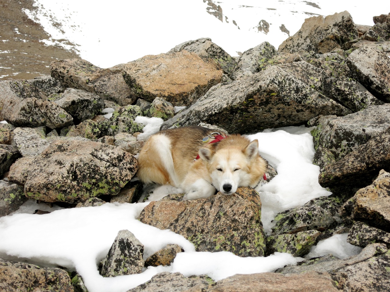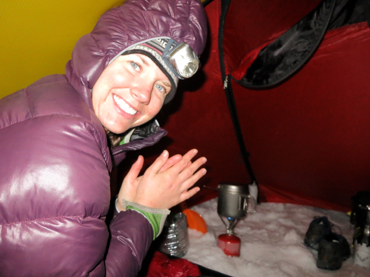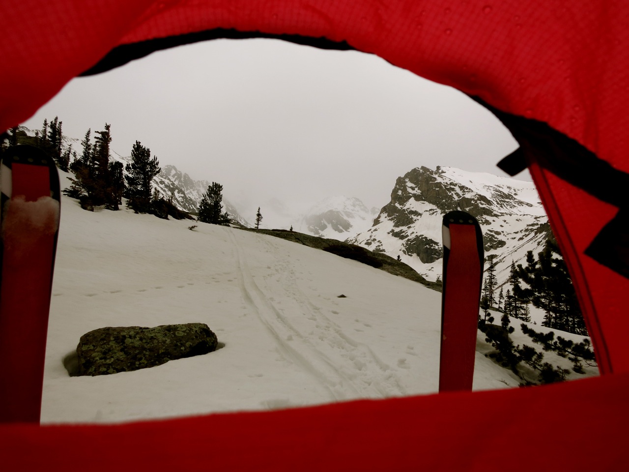 The sun comes up. We have hardly slept. We burrow back into our sleeping bags. #1 rule? Get up early. We ignore it. Dan gets up to go to the bathroom, and reports that the rain from last night crusted the snow up something fierce. A while later, I get up, and confirm it.