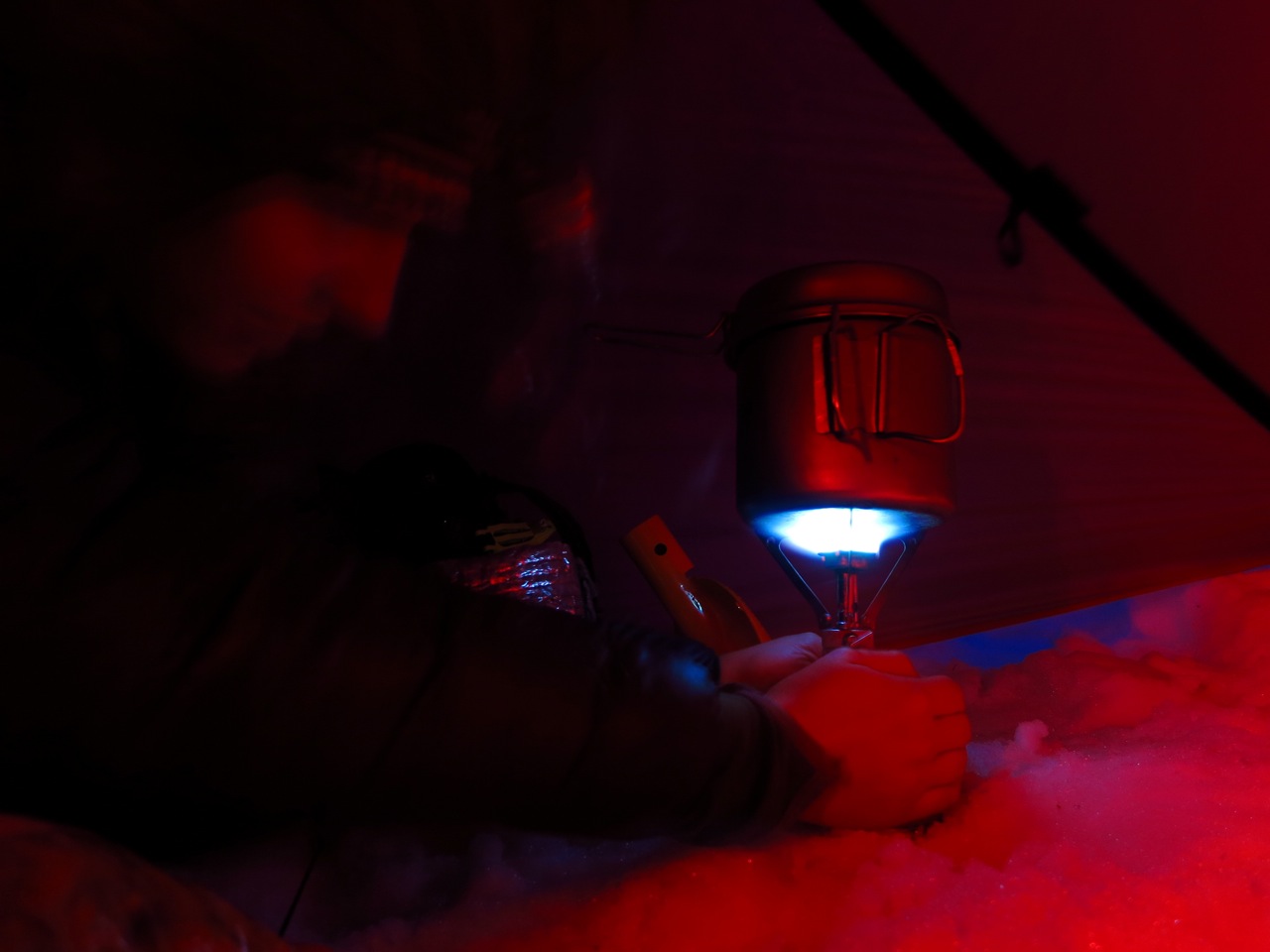 Cooking with a Pocket Rocket on snow requires sacrifice of your own warmth.