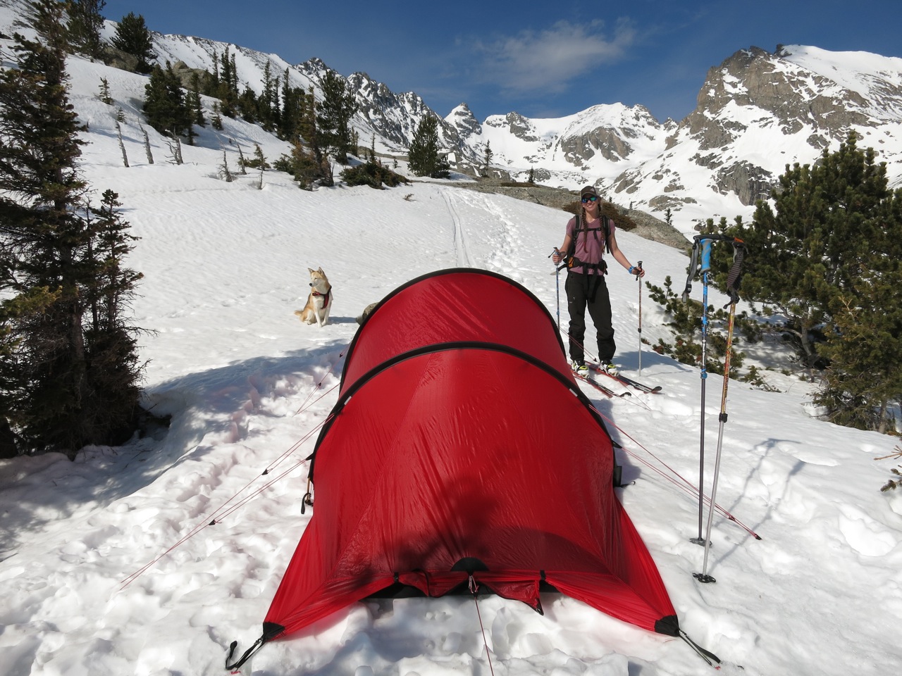 As we head out across the valley, we come across a single tent nestled up against some rocks, and skinny ski tracks leading from it. Up, up, up we go.