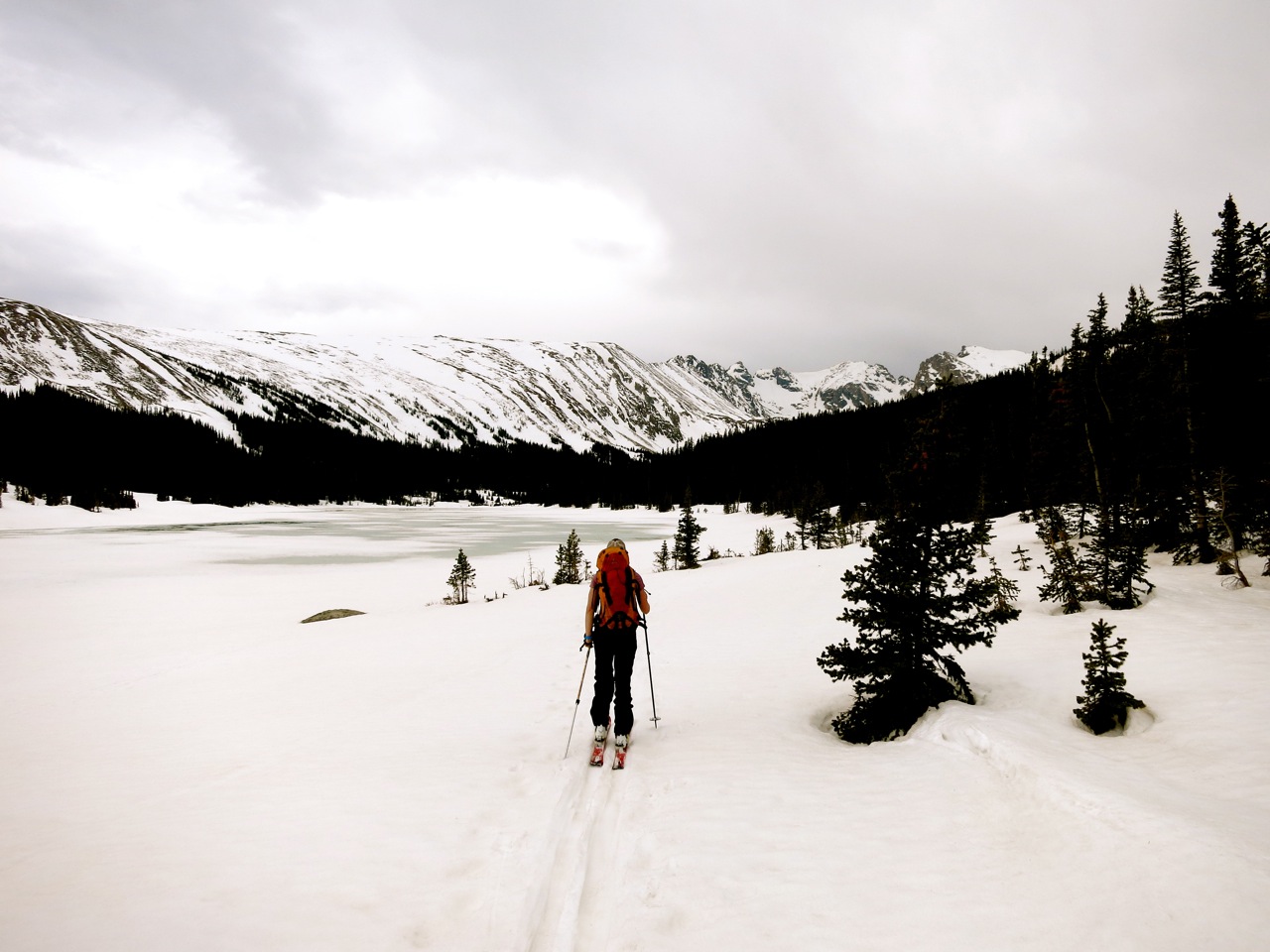 Thus explains why, at 5PM on a random Tuesday in the month of May, we are found to be pulling into the Red Rock Lake Trailhead, seeing as how the gate is still closed to the Brainard Lake Trailhead. Even with the (very decidedly) late start, we were not daunted, got out, loaded up our gear, shoes on feet, and started off for the two miles of road travel before we reached the Long Lake Trailhead. What is a late start, anyway? Sometimes I think that “they” (that ubiquitous they, I really have no idea who “they” are) decide not to plow the road to save money, and just let the high sun simply melt away the last signs of winter. And our brilliant Colorado sun has certainly been to task with the Brainard Lake Rd, although there are still big swaths of snow pillowed on the road. The two miles passed pleasantly enough, and soon we were donning our ski boots on a bench overlooking the still frozen lake, before clicking in and gliding off across it towards the Long Lake Trailhead, the time passing brilliantly. Truly there is nothing better than gliding, gliding, gliding through the wilderness with skis and the one you love.