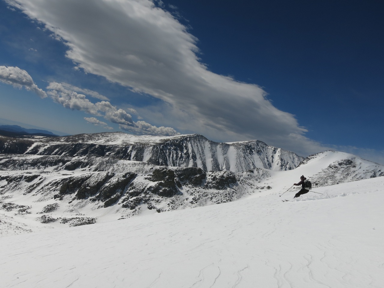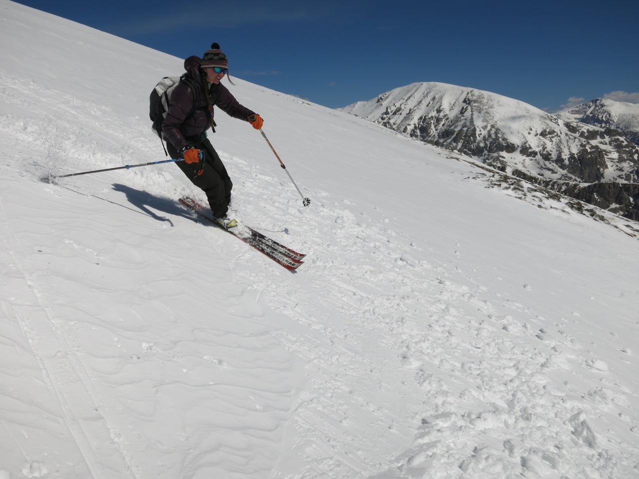 And then we were at the top, all of a sudden like. There had been some storms recently, and there was a plethora of hoar frost on the mountain, with a nippy wind still blowing. Despite it being May, I pulled on my puffy jacket and warm hat. Leaving our skis, we tumbled around the broad summit, ambling this was and that, admiring the view from all angles. Dreams filled us till we were heady with anticipation. But we had a 2,000 ft descent right now! Clicking back into our skis, we began the descent. The first few turns were downright wintery – the velvet feeling of skiing fresh snow, not the velvet feeling of spring corn. A few turns down, it turned breakable, and a several turns were spent carefully avoiding a blown out knee. But then, a little further down yet, the snow turned to that smooth, easy corn that you stay on top of, and it was cruiser down to the lake.