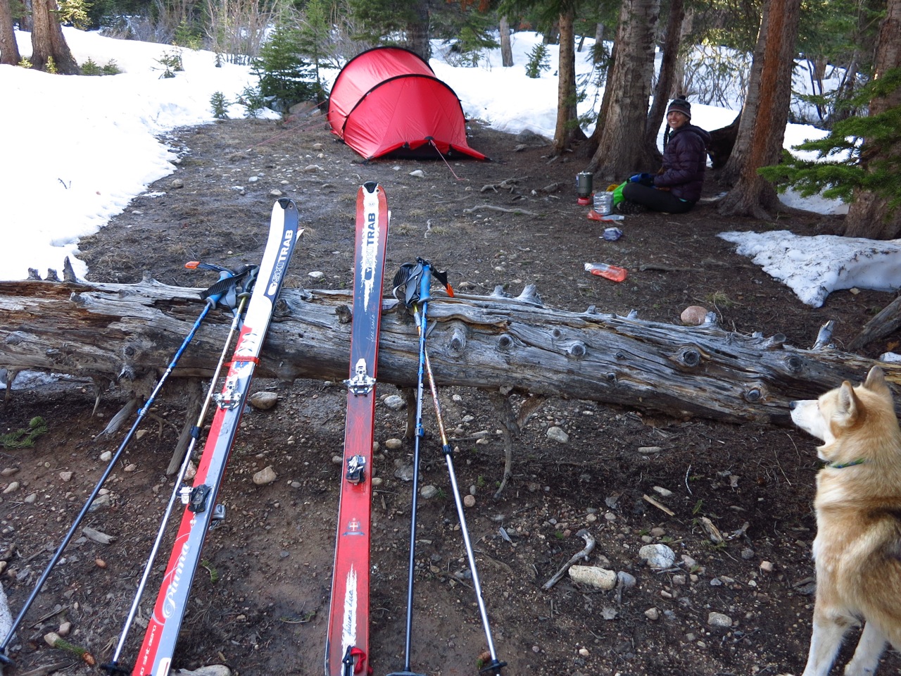 Soon we were post-holing through rotten snow, and being the stubborn, pigheaded people we are, we put our skis on once, but after having to remove them for a sketchy river crossing, we just post-holed the whole way. After about six miles, we found a section of dry ground.