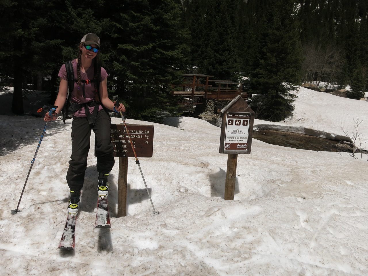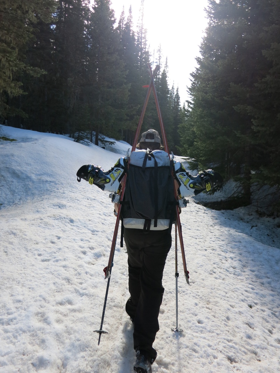 After meticulously parking due to the plethora of “NO PARKING” signs around, complete with a hidden camera in a bird house (walking along, what is that strange reflection in the bird house? Damn, it’s a camera. Odd.), we piled out of the car, strapped our skis to our backs, and off we went. The road was completely dry, making us think that Camp Dick was probably to be opened for Memorial Day weekend. It was a mile long road walk tacked on, and after a bit, we reached the trailhead. Apparently, you can ride a bike, or drive a “very high clearance” vehicle on this road. I for one, would not like to do either.