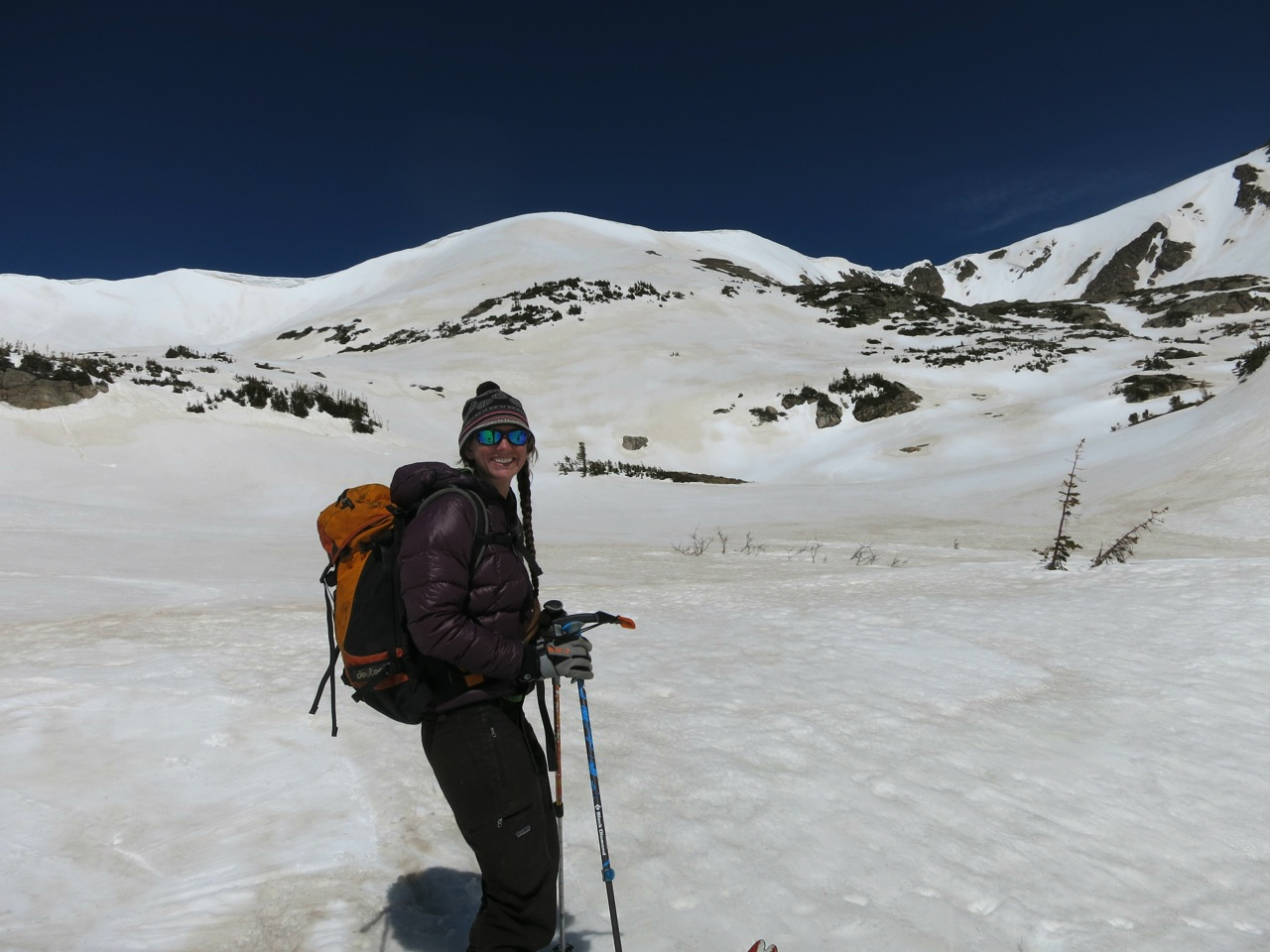 One of the things about spring skiing is when you’re hiking out, and you’re on a part of the trail where the snow has melted, and people are shocked that you have skis.