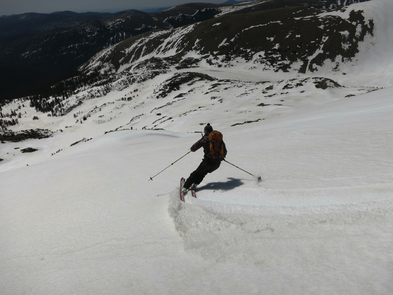 We clicked in, standing, debating, and then dropped in. Frosty is just fun. It’s mellow, beautiful turns that you can link for a good ways down to the Arapahoe Lakes, and then pick your way down through the trees to the trailhead. A simple ski, good for a post-work -week shakedown.
