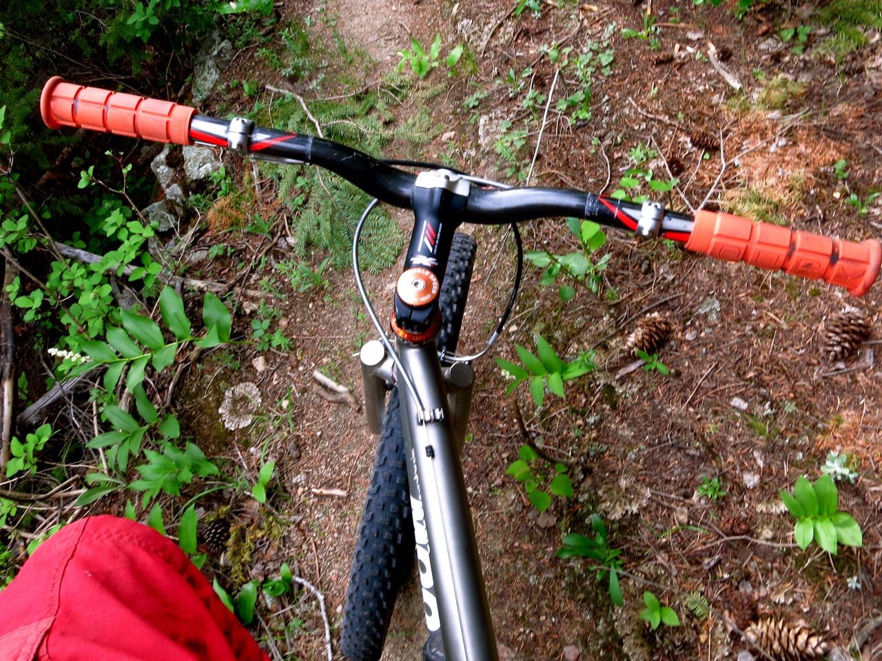Well, it had to happen sooner or later. Elaine had her first mountain bike crash of the year. A good one – bopping along, caught her handlebar on a pine tree, got knocked down hard. Hit her elbow good, shed some skin, scratched a little paint off her head tube on the Stumpjumper.