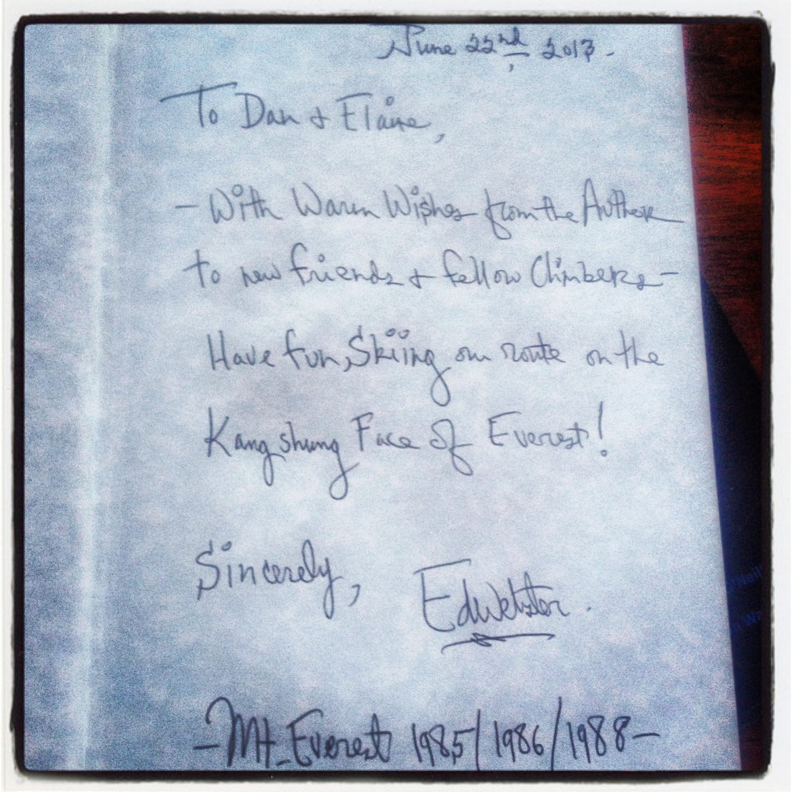 A highlight for me was when Ed Webster, a man who pioneered a first ascent on the remote, brutally difficult, and almost never-climbed Kangshung face of Everest signed his book for me, with a very special inscriptions shown in the photo.