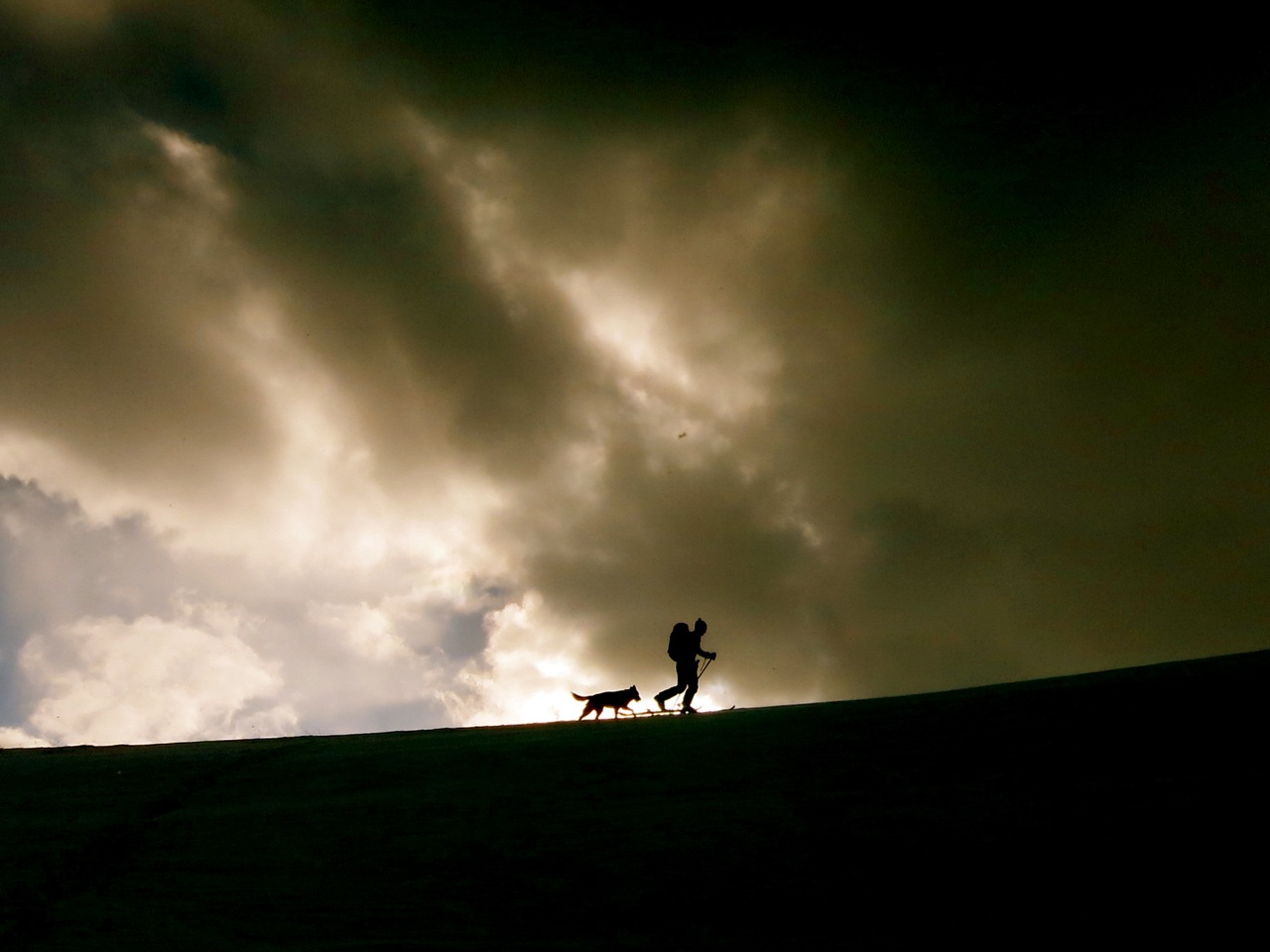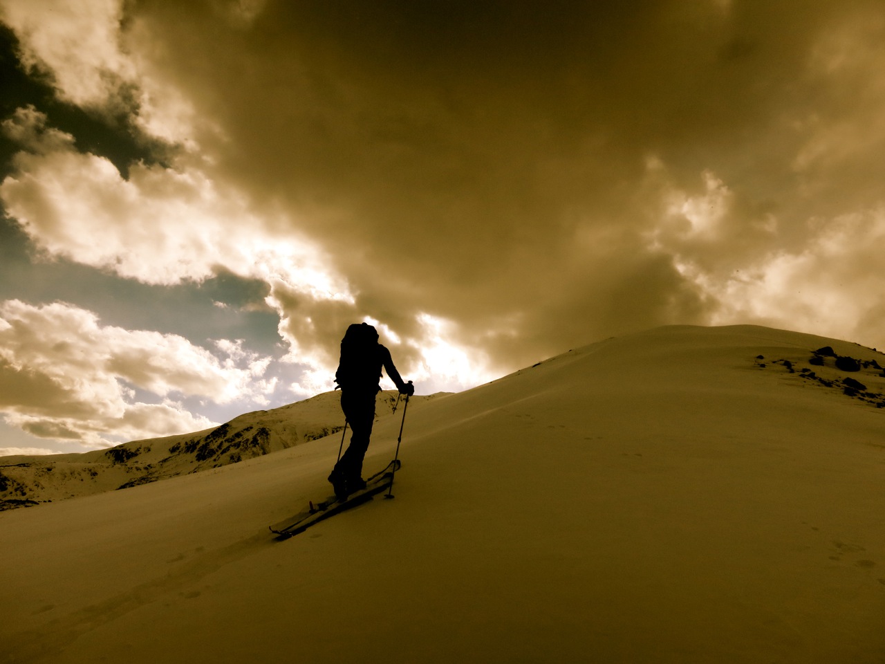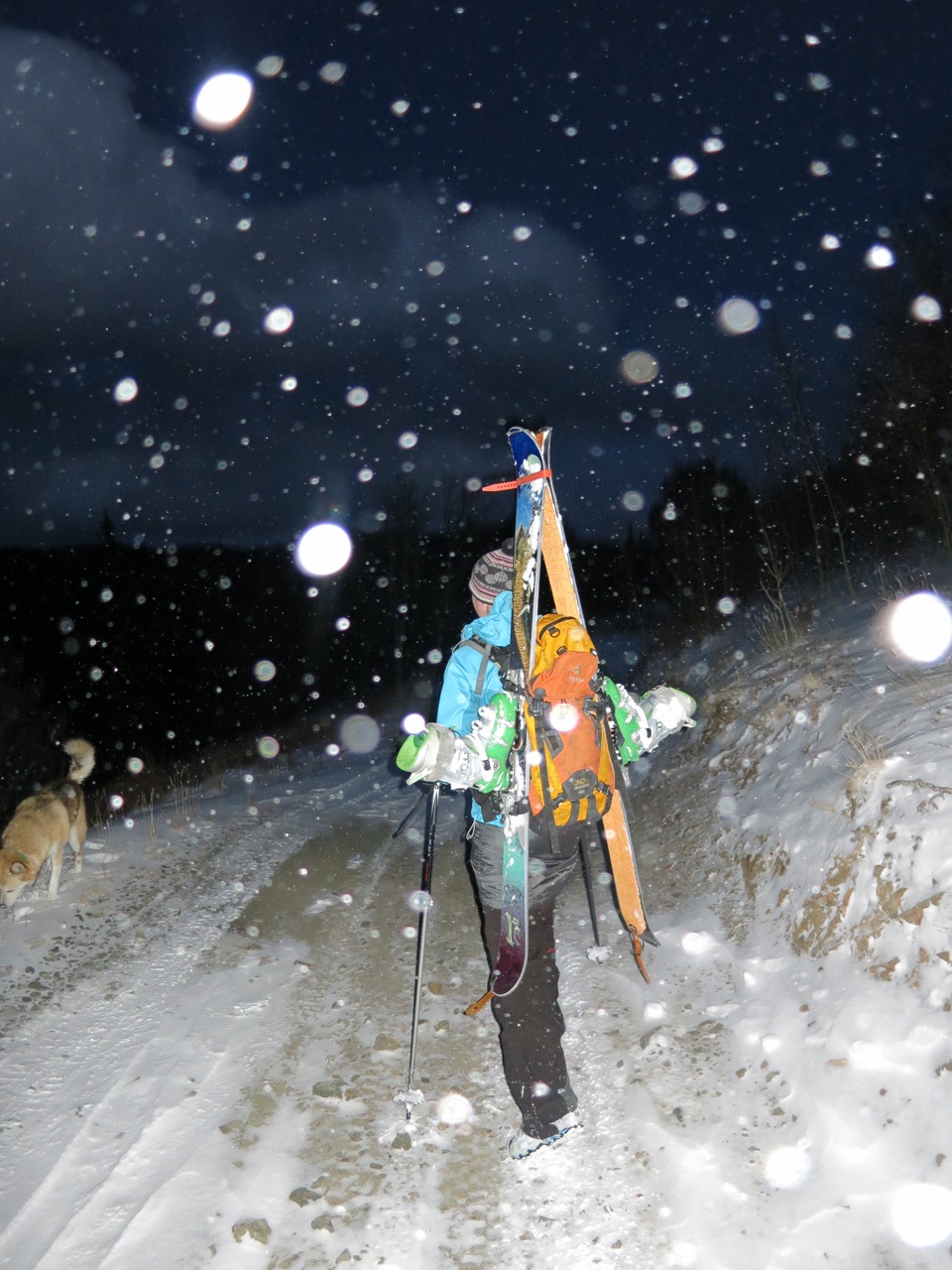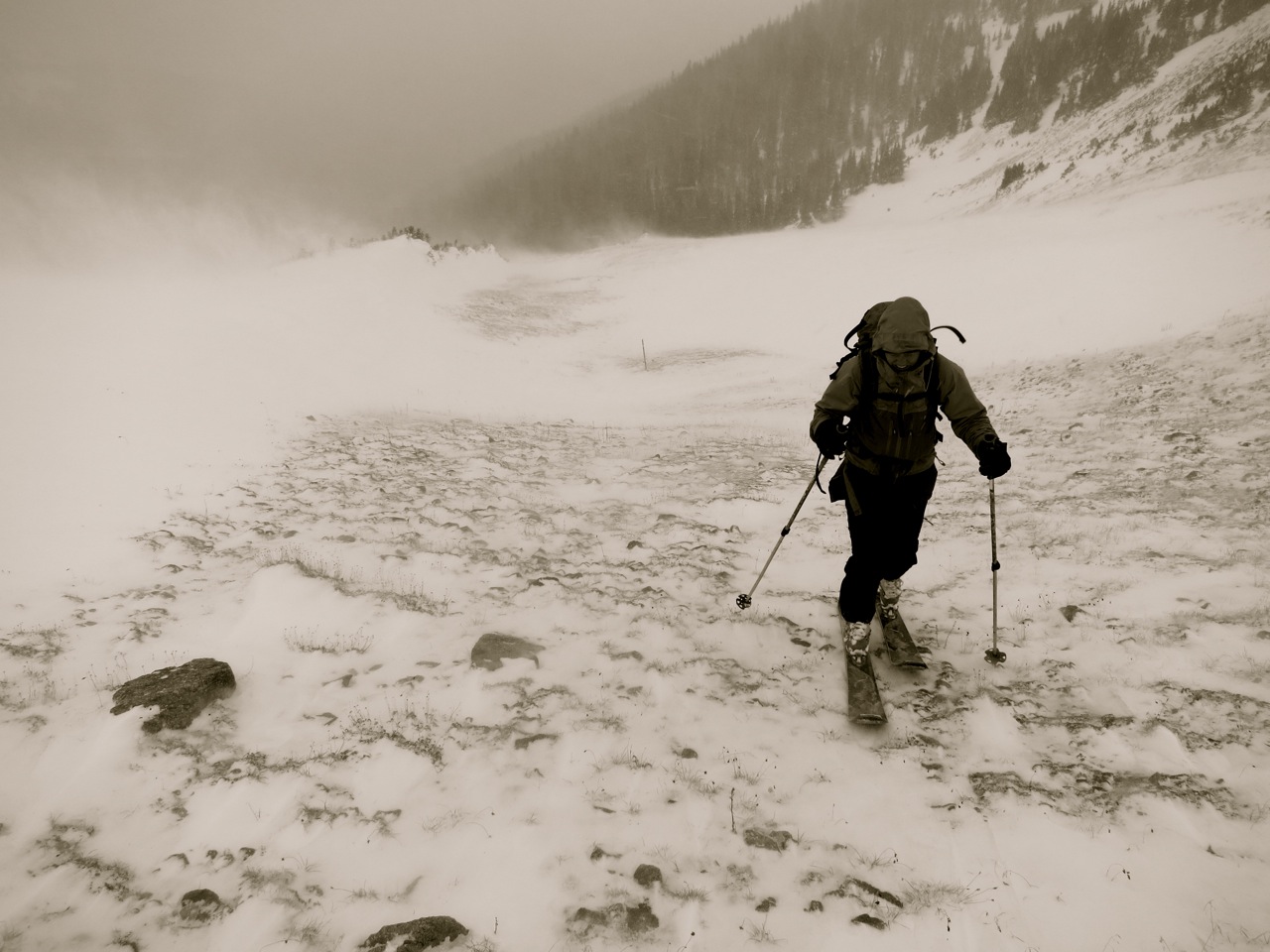 As the sky rages to the west, Elaine does her first skin rip of the season on October 17, 2013. I've got no shots from the descent because it was lousy. We were punching through and hitting rocks on nearly every turn. The rule of thumb in those conditions – lean way back and have a pair of rock skis. A long, good season requires reliable rock skis. For me, it's my 156 Icelantic Nomads that I've had since 2005. They do the job well, and while my quivver has grown significantly since then, they still have a definite niche in the early season.
