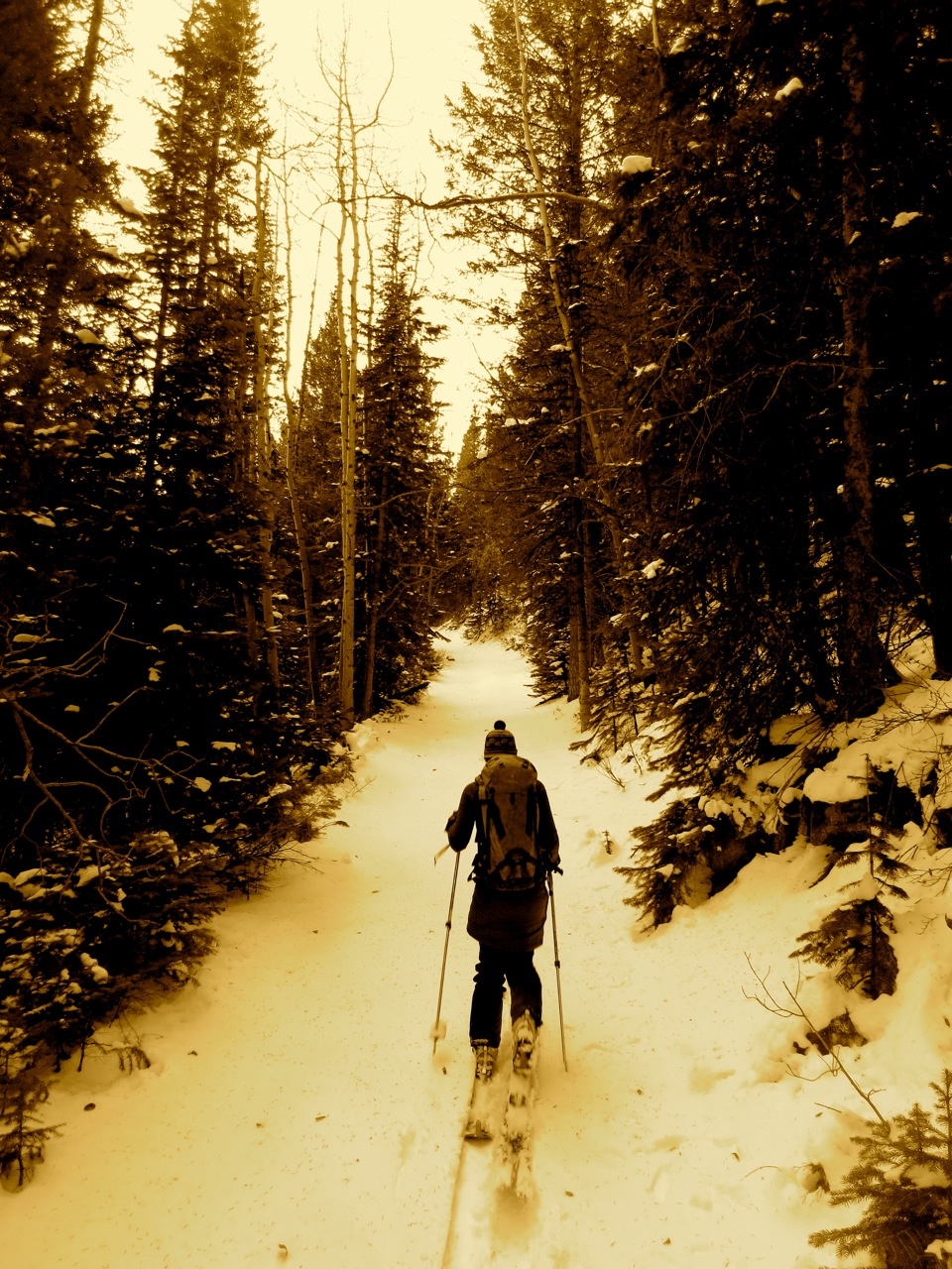 Day one and the first skin of the year was up Butler Gulch. This is a popular Front Range backcountry area about an hour-fifteen from home. Elaine and I usually go here a few times early season to get our skinning legs under us. It's a solid 1,800 foot climb to the top of a minor peak along a ridgeline. It's a great place to start the year, made moreso by the splendid light of the setting sun.