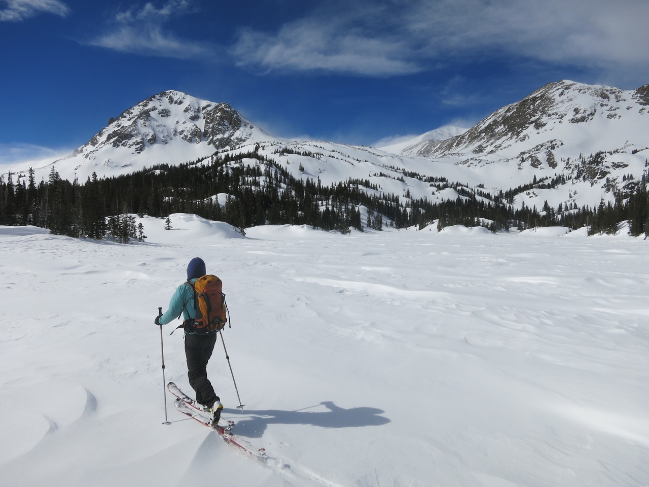 A couple days in a row now, Elaine and I have expanded our skiing adventures to get way back up in the mountains. Places we normally only venture to in the summer. Two observations: