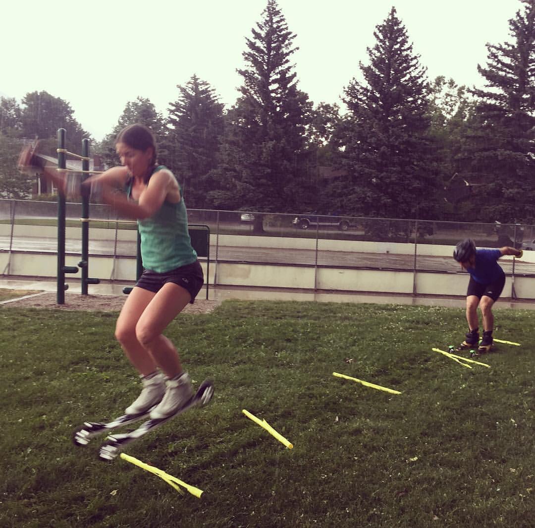 During the class I got to enjoy the simple pleasure of roller skiing in the rain, the brutality of skiing on 110 degree tarmac and everything in between. We skied up and down hills with medicine balls, we skied while towing people behind us, we skied with no poles while bouncing basketballs in front of us, we tackled scary descents and went faster on them than we’ve ever gone before. The class took us out of our comfort zone, and that’s when you improve the most.