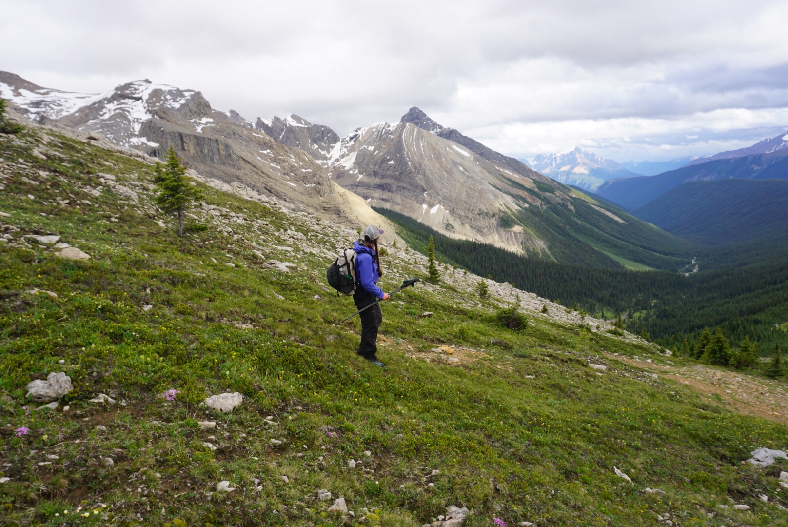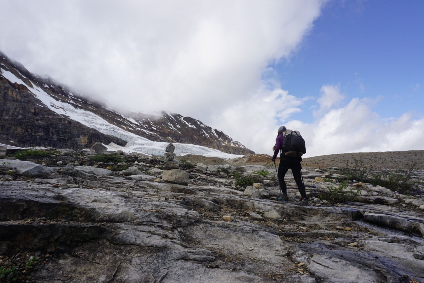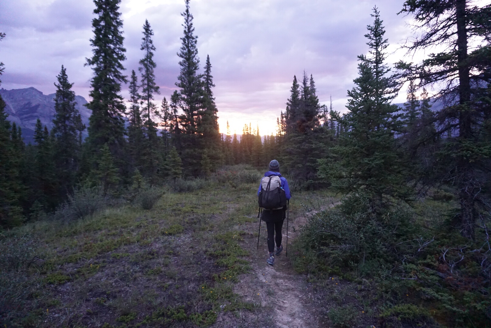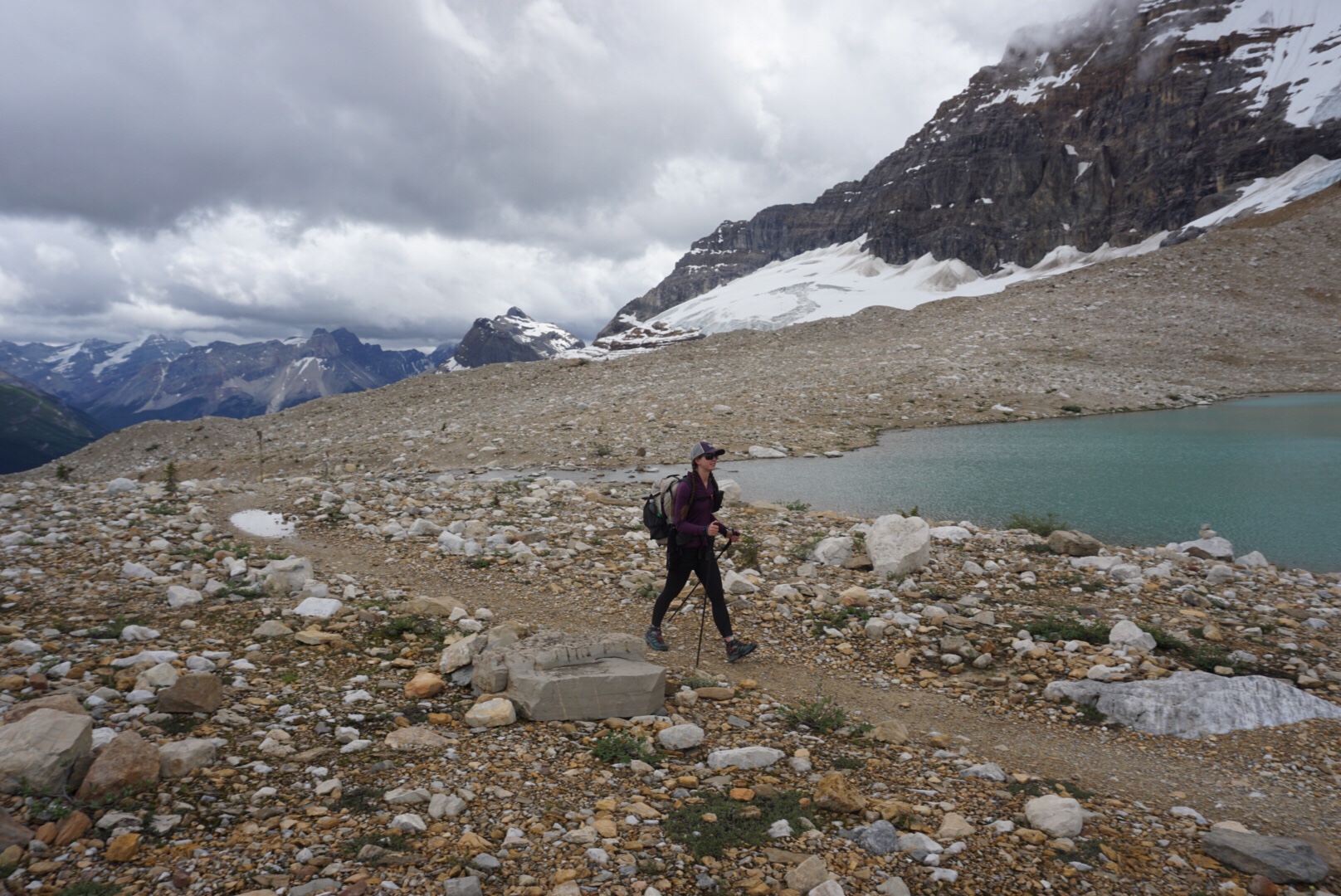 It was fine trail and we made good time, save for the constant crooning of necks we’d do looking in awe at the surrounding scenery. As we exited the Iceline Trail, the clouds began to build again and soon lightning was striking nearby peaks. After a quick check in at the local Alpine Club of Canada hut to see if there was room to get out of the rain for a few minutes (there was not), we began the climb up Kiwetinok Pass.