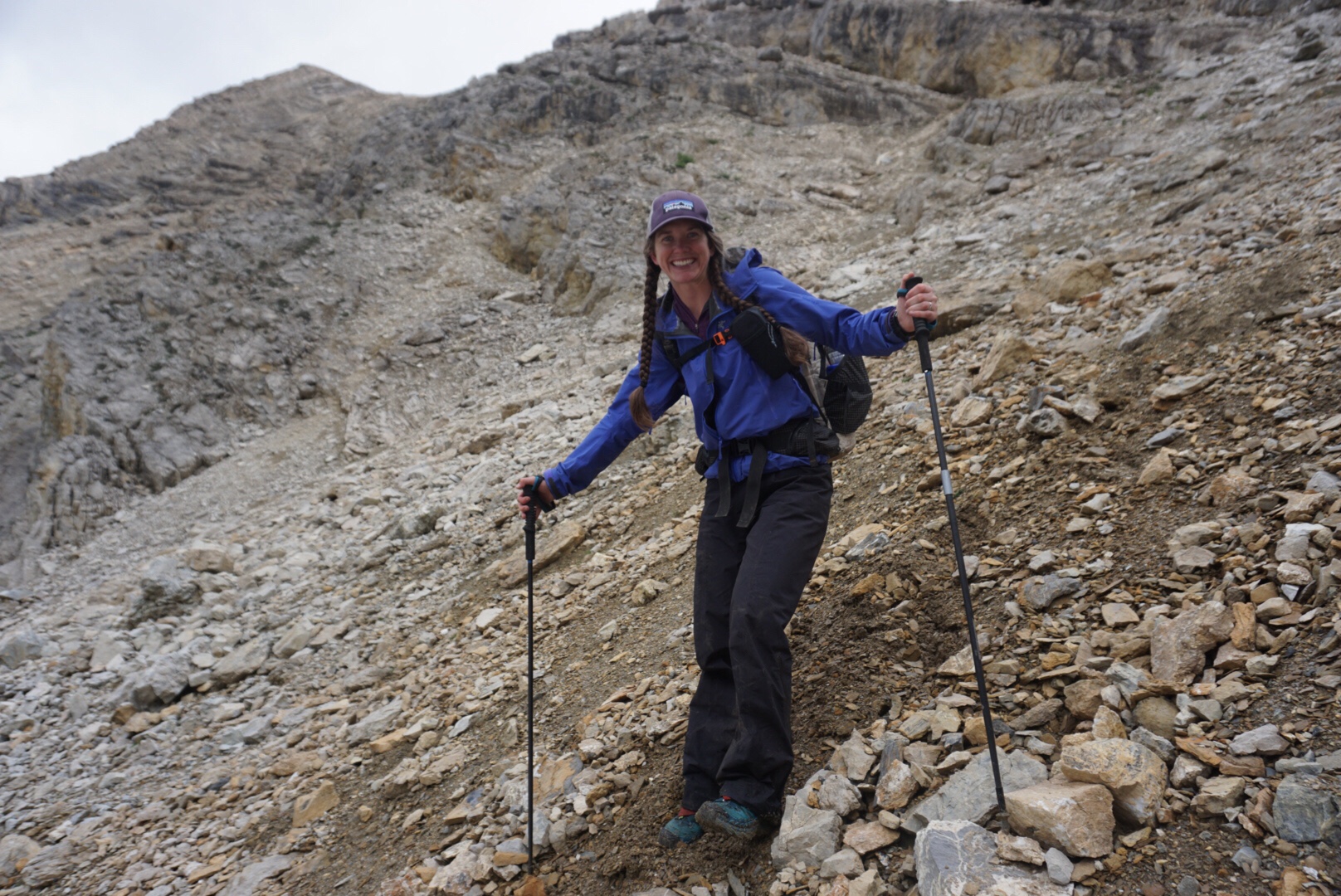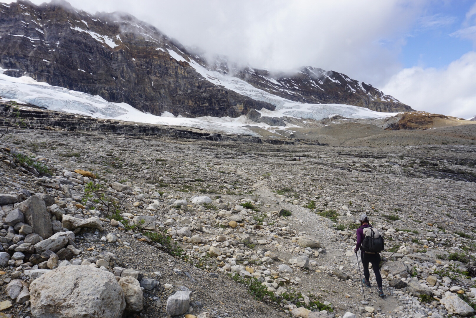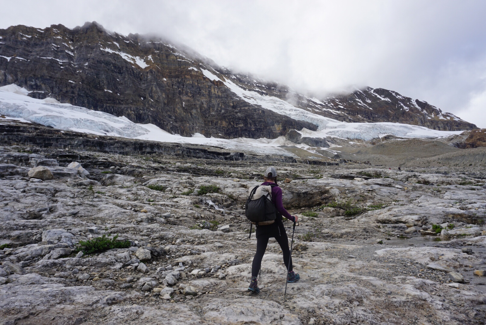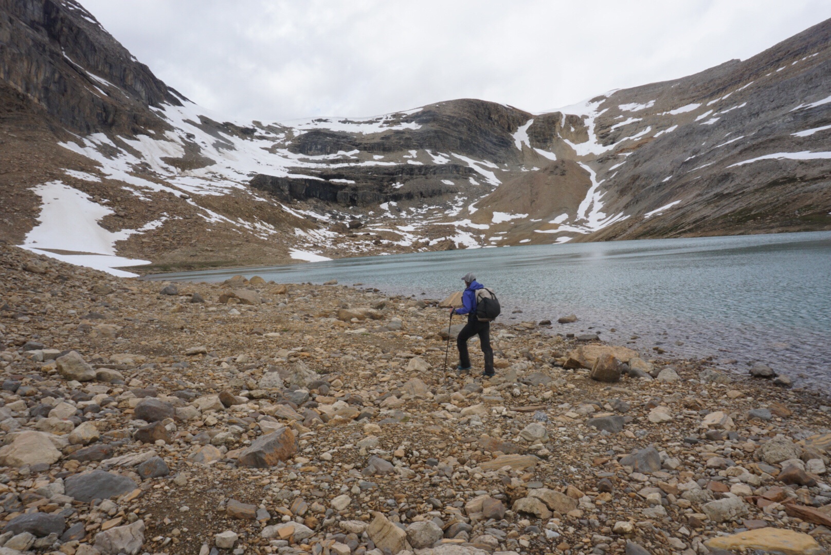 It was fine trail and we made good time, save for the constant crooning of necks we’d do looking in awe at the surrounding scenery. As we exited the Iceline Trail, the clouds began to build again and soon lightning was striking nearby peaks. After a quick check in at the local Alpine Club of Canada hut to see if there was room to get out of the rain for a few minutes (there was not), we began the climb up Kiwetinok Pass.