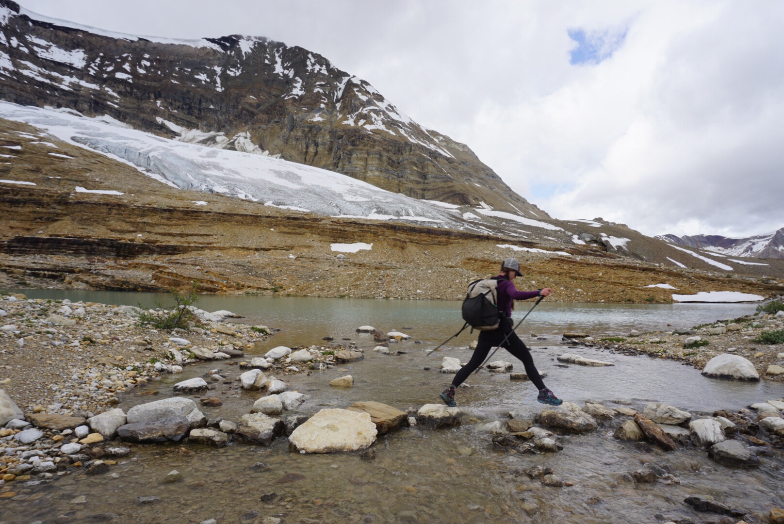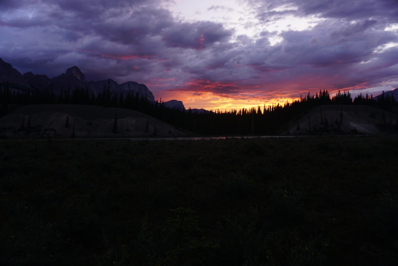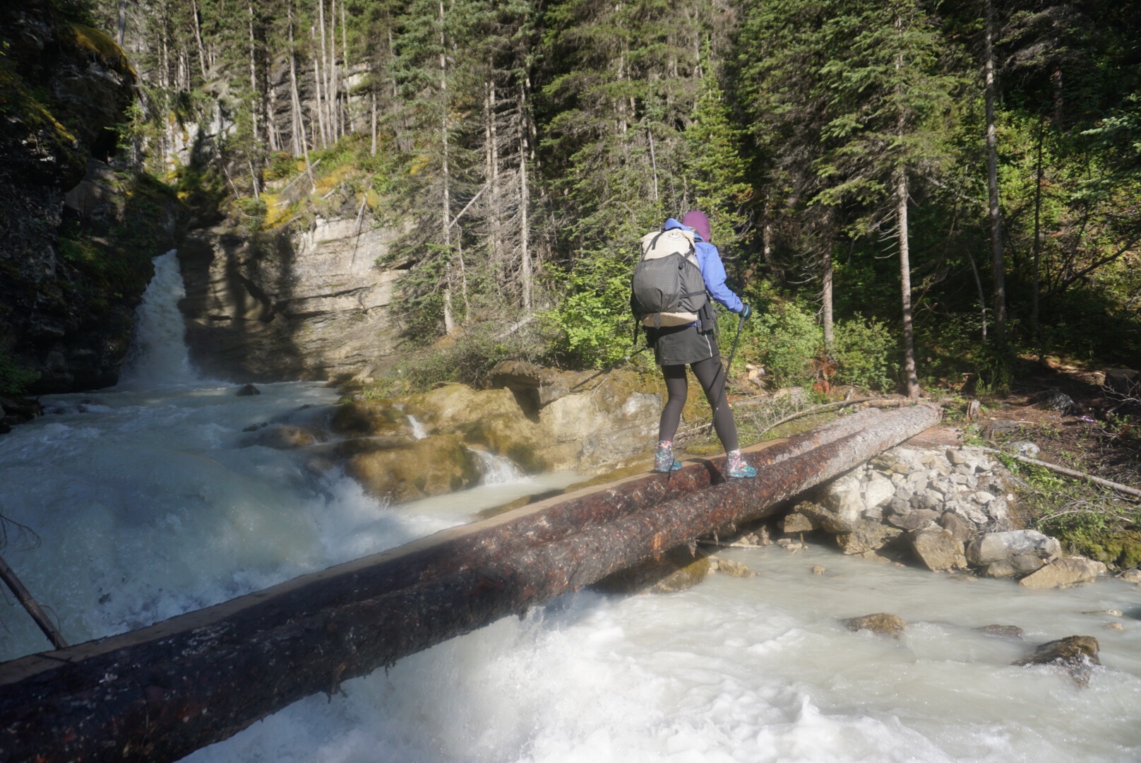 Today is a resupply day at Saskatchewan Crossing. We got up at 5 am to meet Keith, who is dropping us off our resupply box at the crossing at 7:30. The walking is easy and the sunrise glorious. We cross a deep chasm called Mistaya Canyon before meeting Keith’s trusty red van once again! It goes without saying that without Keith and Leslie, this trip would not have happened. We are forever grateful to them.