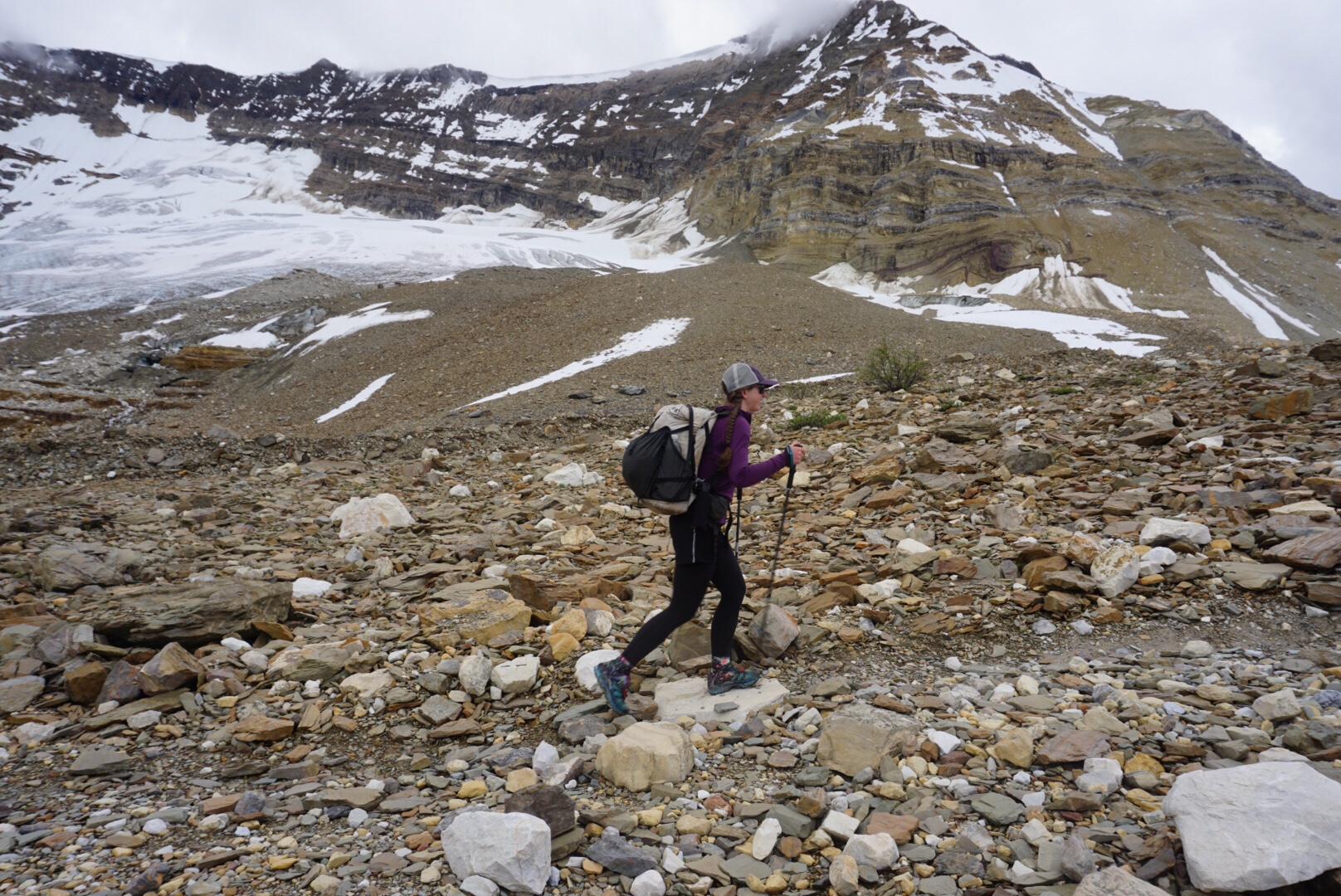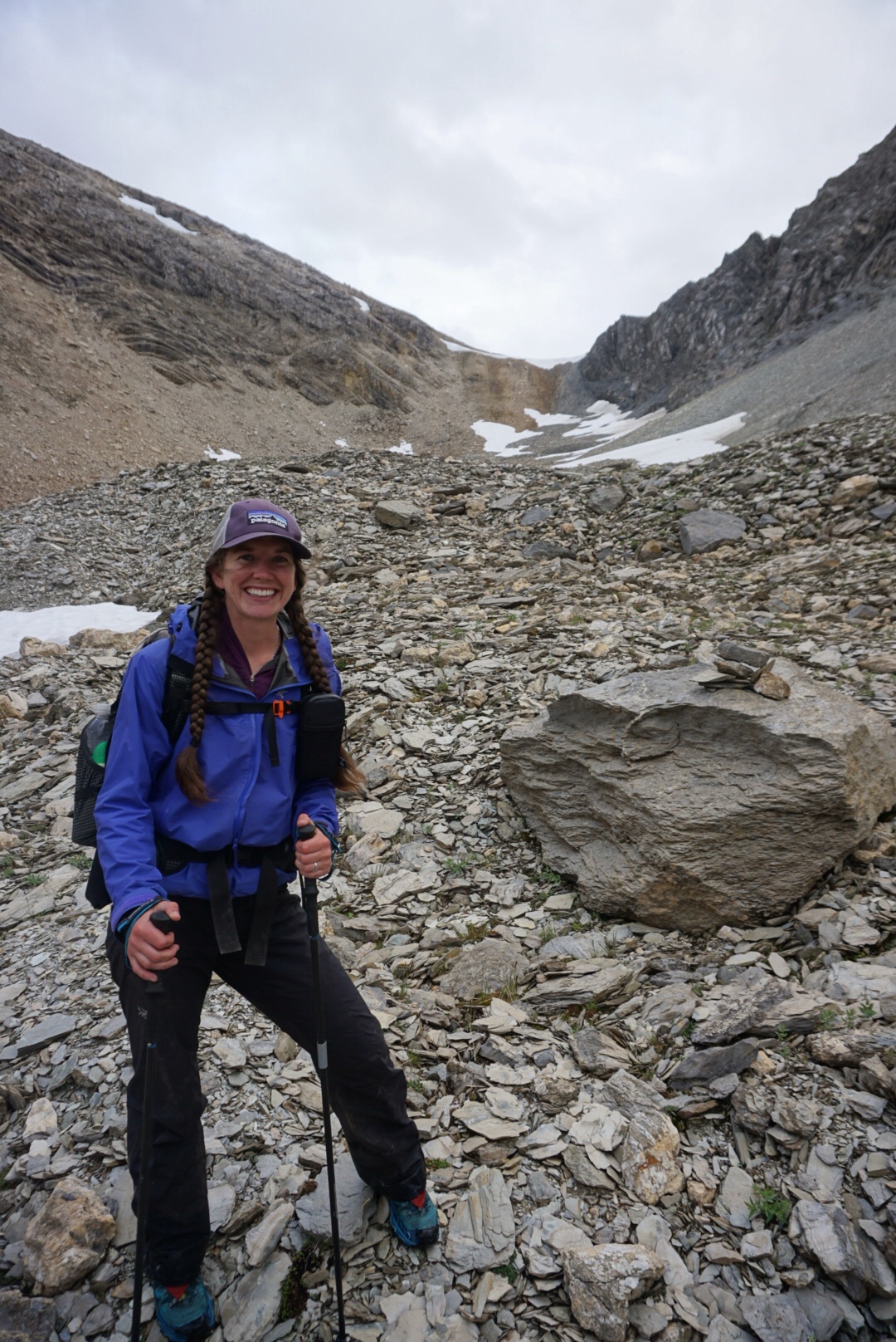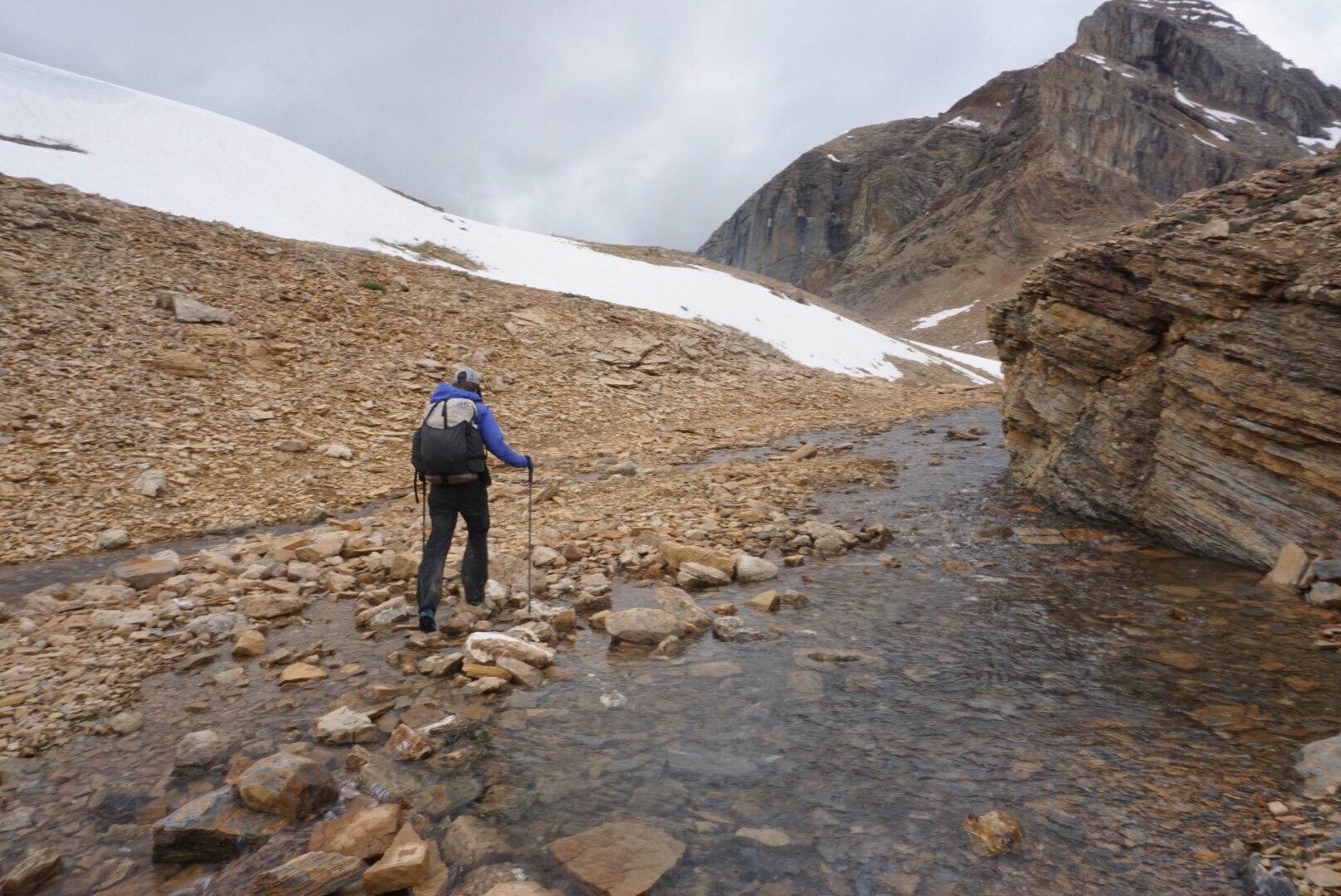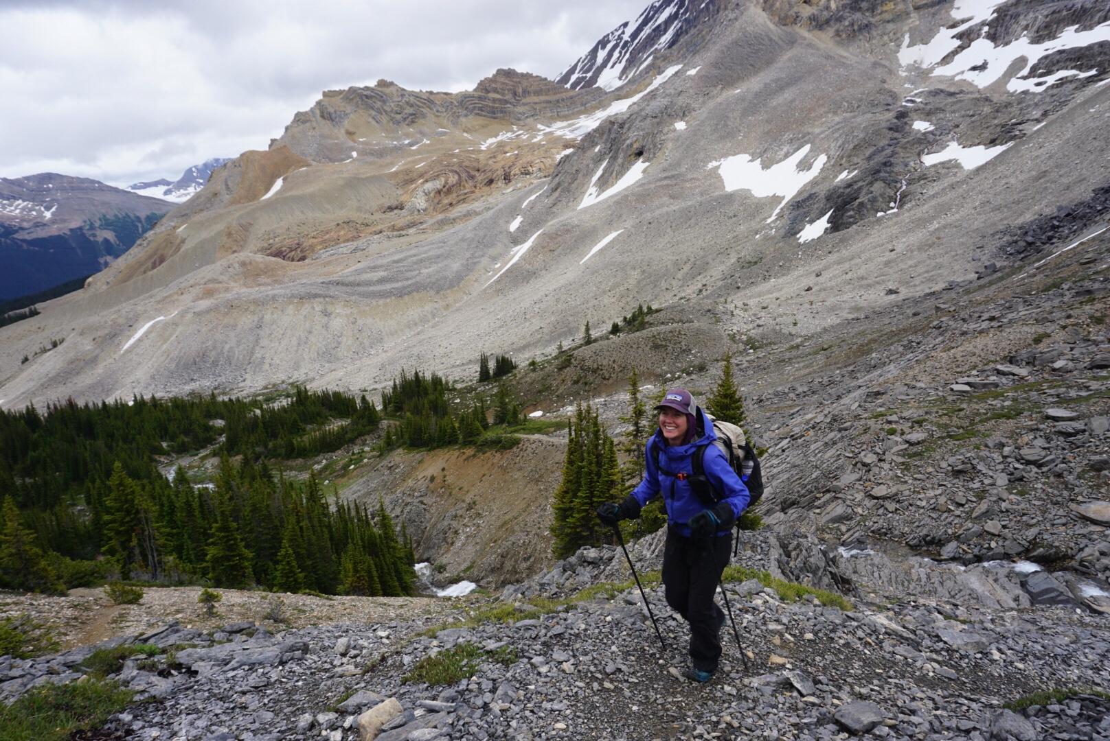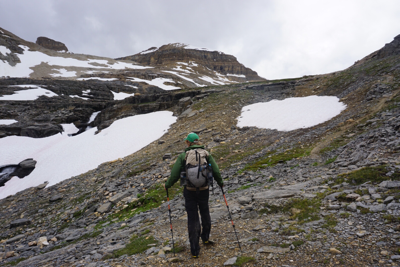 We began the climb over Yoho Pass and it started to rain hard and blow a cold wind from the north. Getting wet and hiking in rain is part of this game, but neither of us were particularly pleased with this development right after town days. Our itinerary for the day called for a hike on a high trail as well as a pass crossing, so getting lightning in the first hour of the day was less than promising.