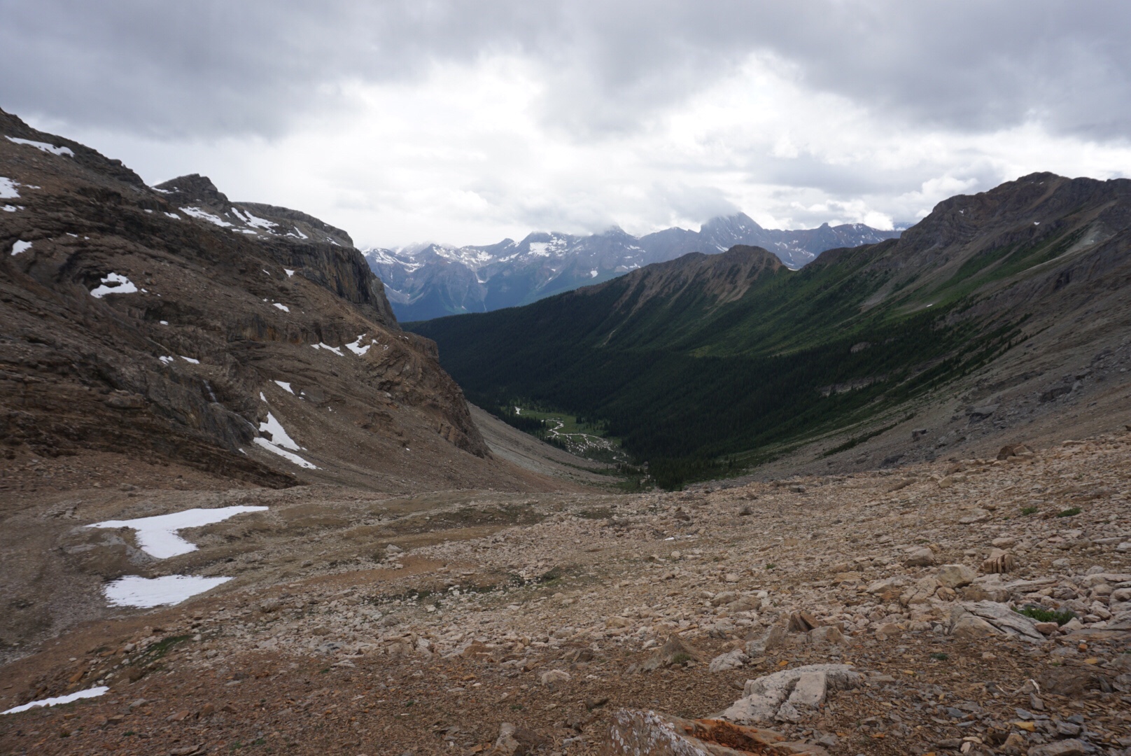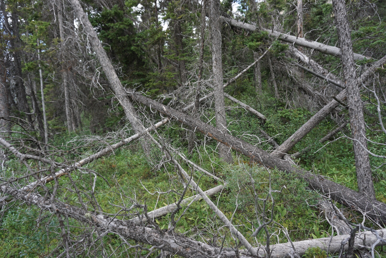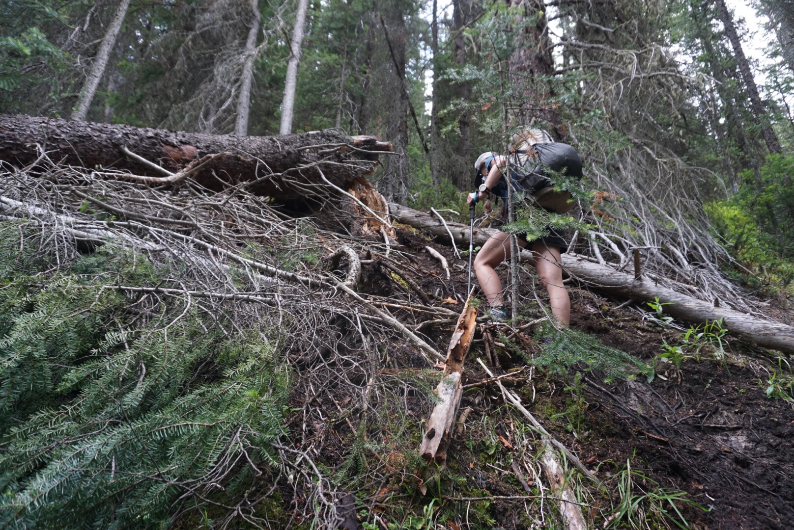 We hurried down the snow and scree, as weather clouds were building again and we didn’t want to be stuck in a dense forest all night. The first part of the descent was easy enough, and the upper trees were widely enough spaced that going was slow, but manageable. This changed for the worse however, and soon enough we were reduced to an almost crawl like pace. An old forest fire left hundreds of downed trees everywhere and it was frustrating travel.