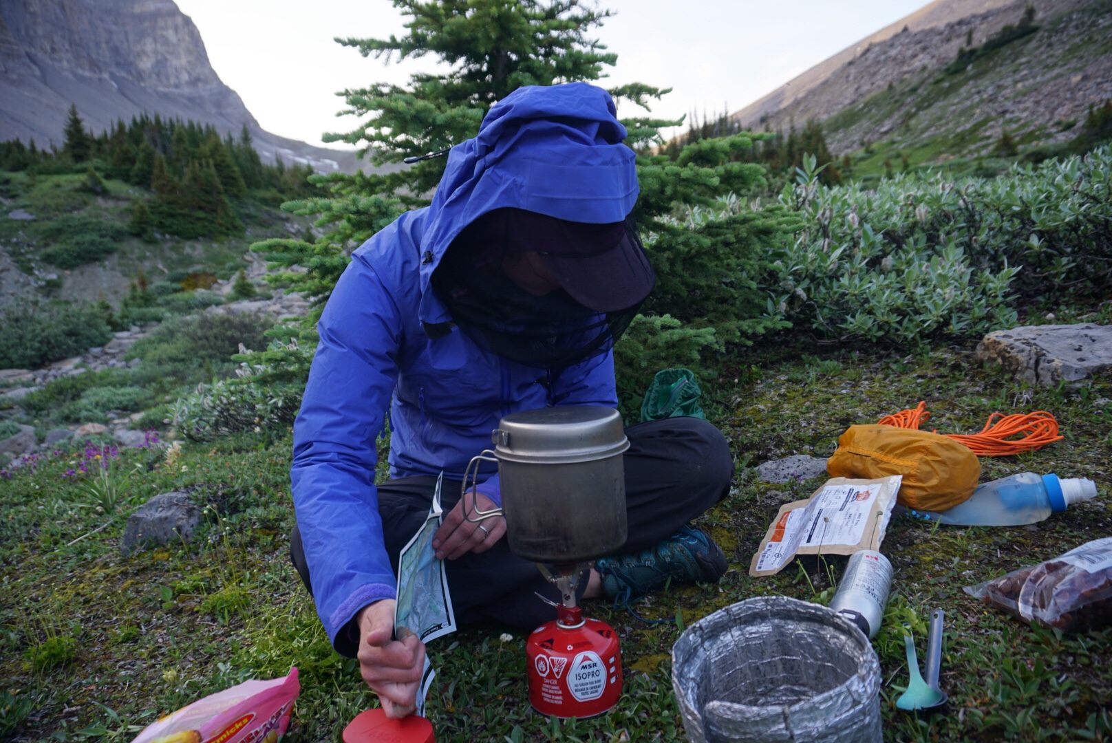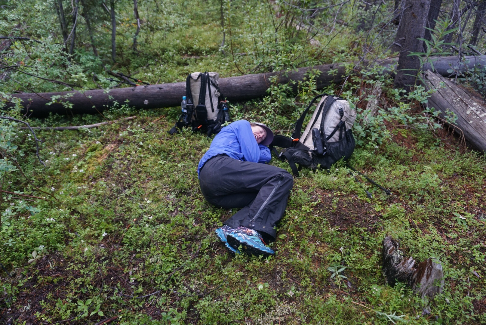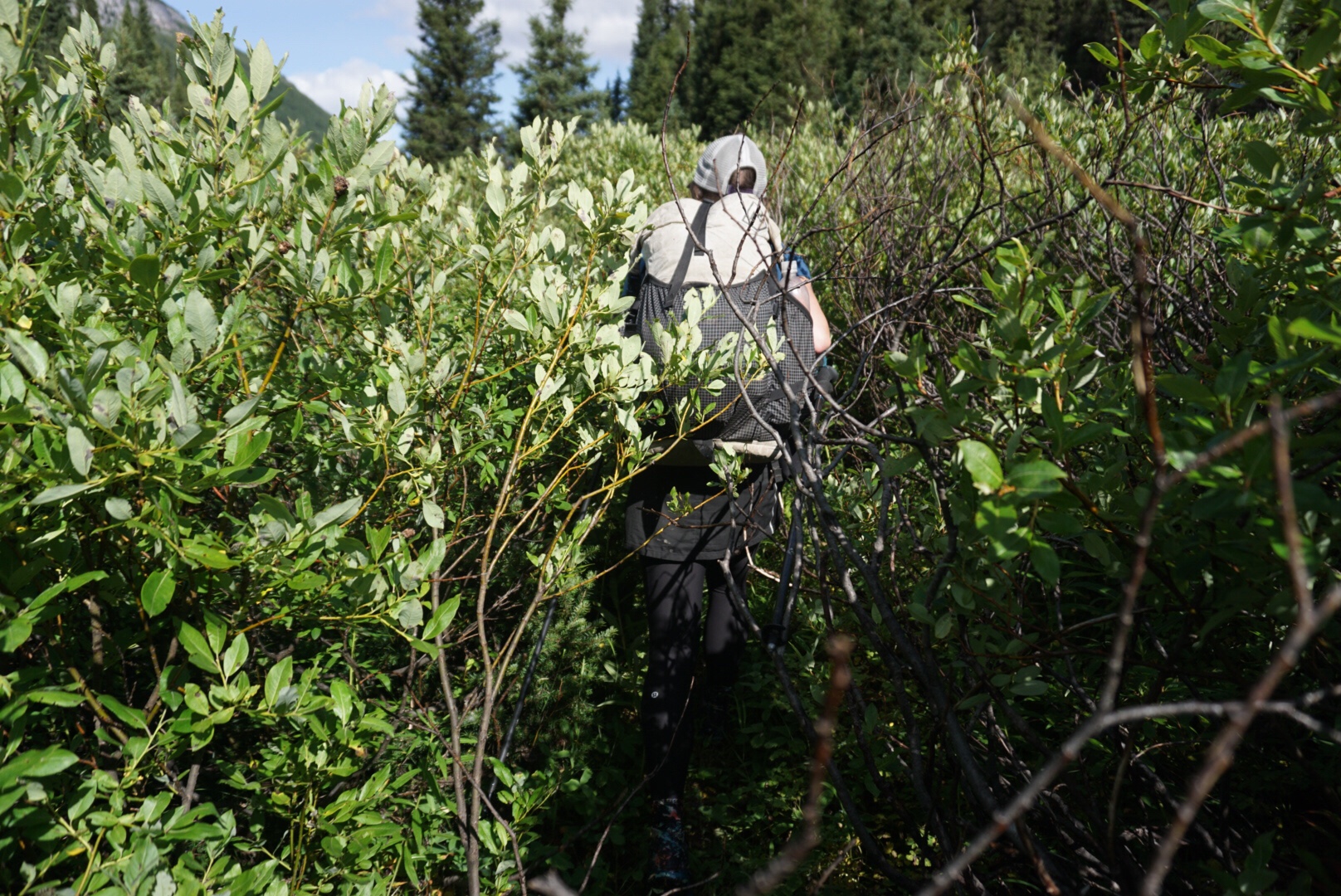 The logic was as such. We’d seen no bear scat in the area, and it was so dense that it didn’t seem like a great place for bears or any animal to travel. Also, we were borderline hypothermic. If we ate outside we almost certainly WOULD be hypothermic, and a problem at hand is usually worse than a potential problem in the bush, so to speak. We chose our least smelly meal, a bland pasta, and still did a bear hang with our Ursacks, It’s not something were proud of and in retrospect we would have been better off stopping at the tree line. Lesson learned, move on. Turns out, despite the ridiculous contouring we had to do to find a somewhat flat place to sleep, we had one of our best nights sleep on the trail to date.