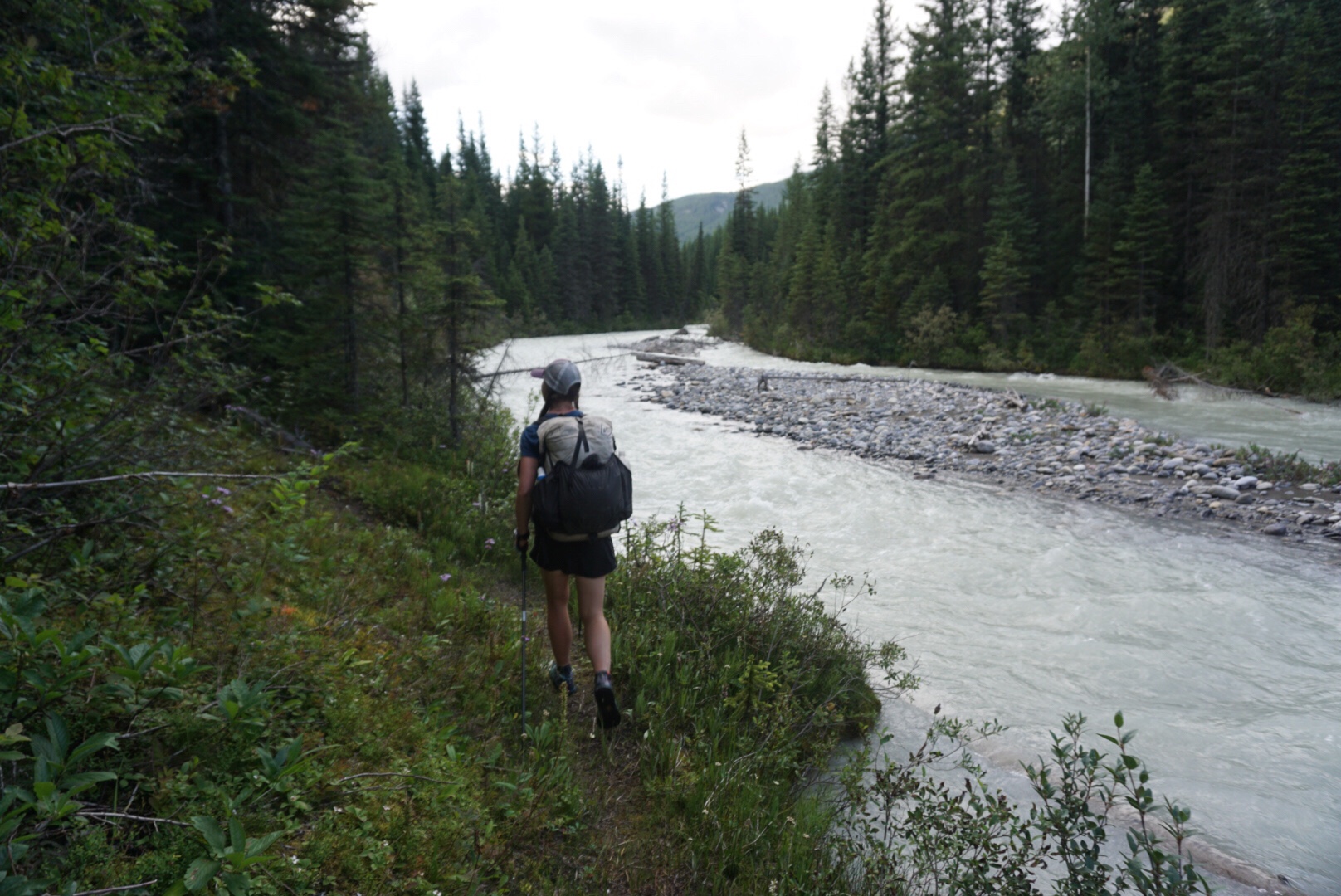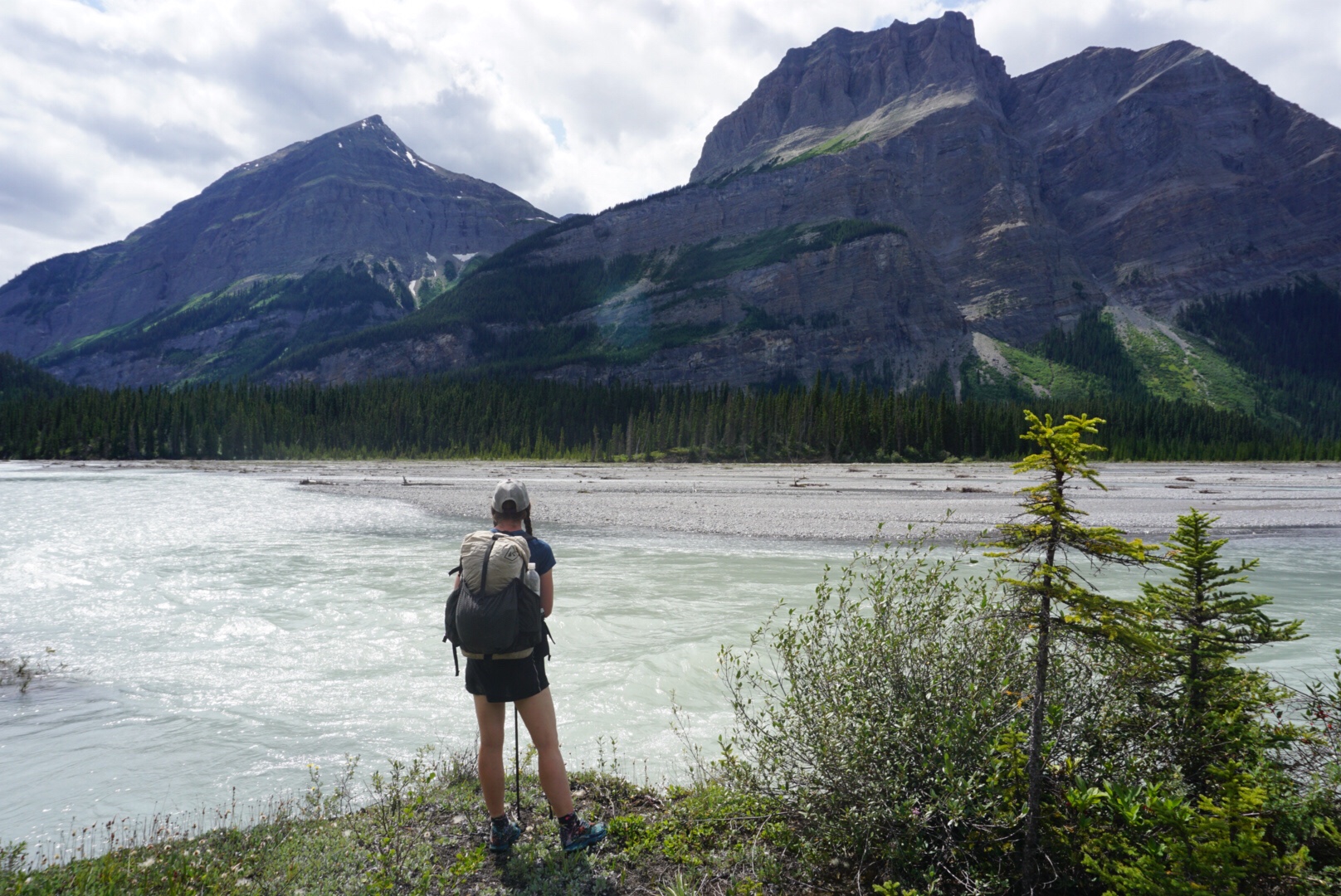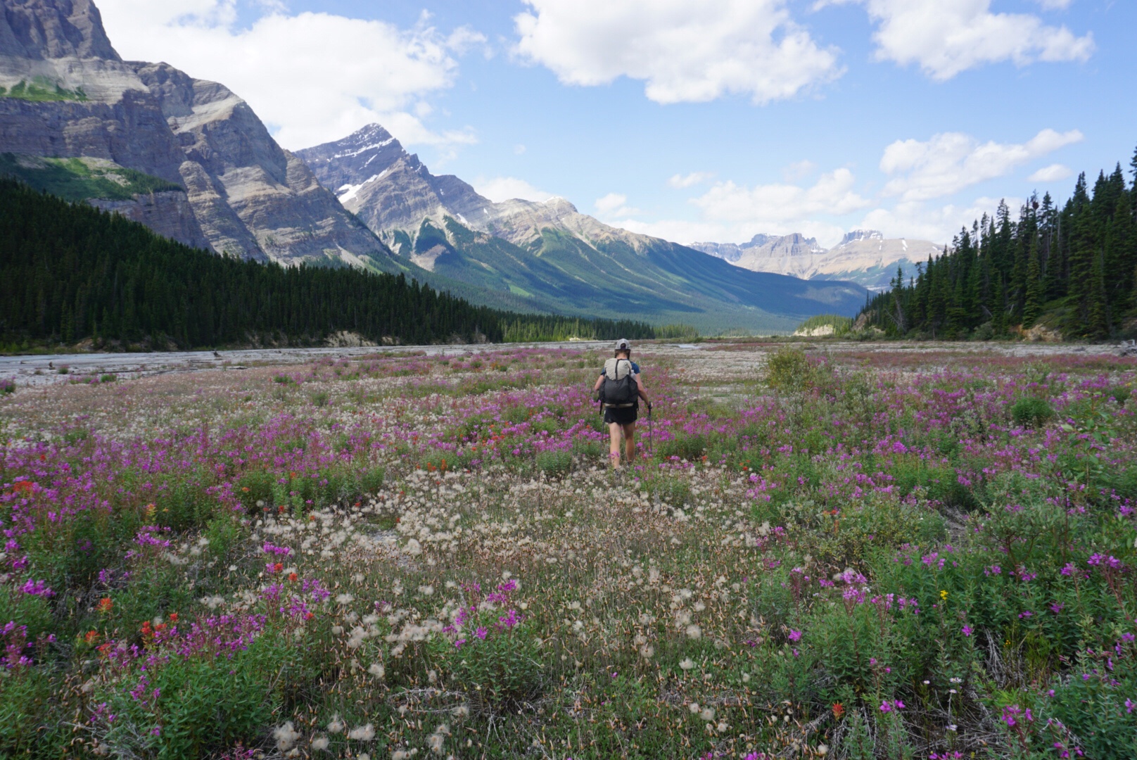 We steadily climbed up to Howse Pass, a historic traffic route that marks the lowest crossing of the Continental Divide in these parts. We won’t cross over into British Columbia and the west side again for another 150 miles. The trail descended to the Howse Flood Plain, a massive, glacially fed valley with the river braiding everywhere. Massive peaks surrounded the valley and for the most part the travel is easy, with some notable exceptions. Sometimes the river channel comes right up to the forest, forcing hikers into some absolutely heinous bushwhacking that at times reduces travel to less than a mile per hour. More than once I wished for my packraft in this section. That’s an idea for future hikers – bring a light little raft and float the Howse to Saskatchewan Crossing!
