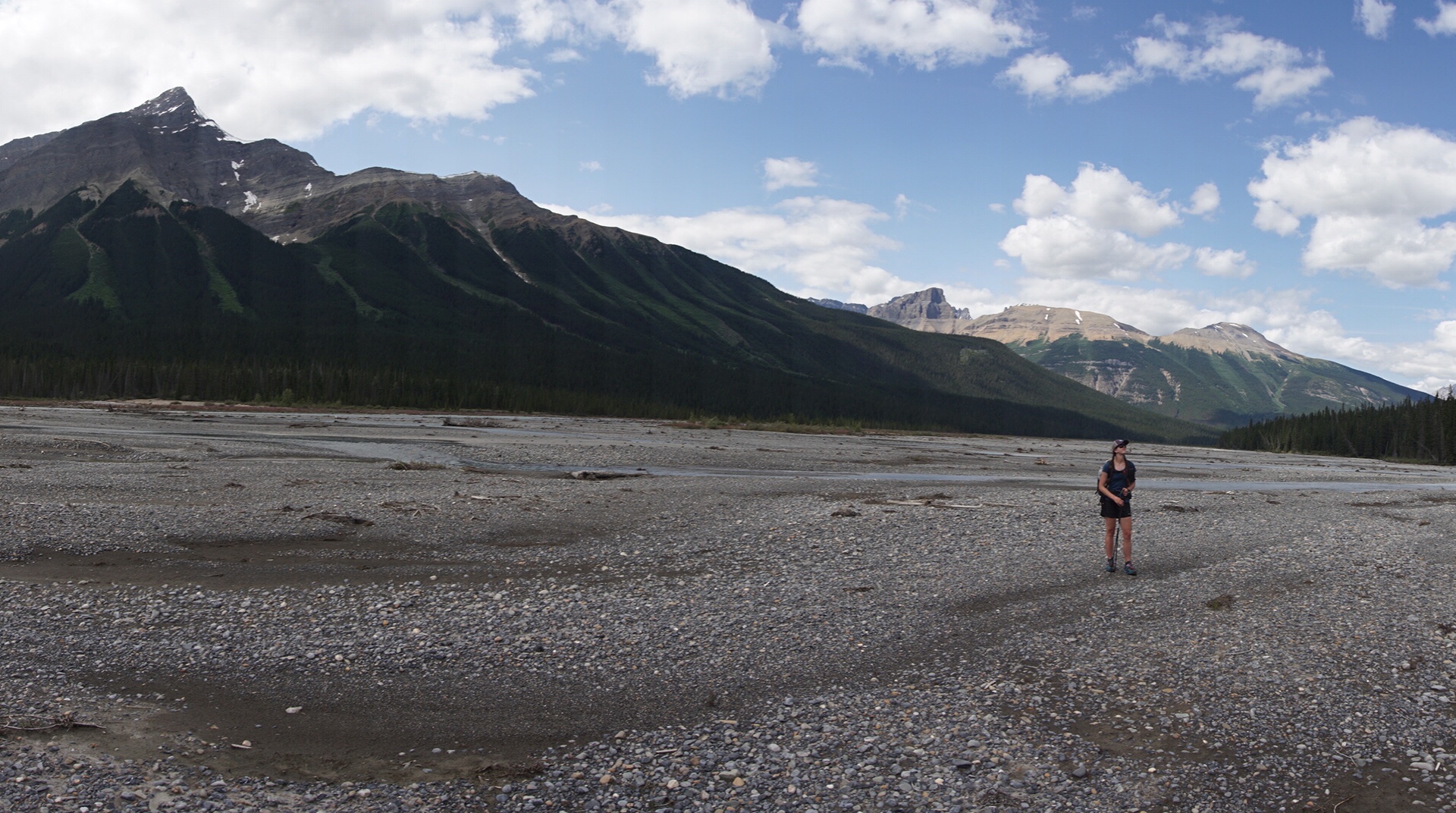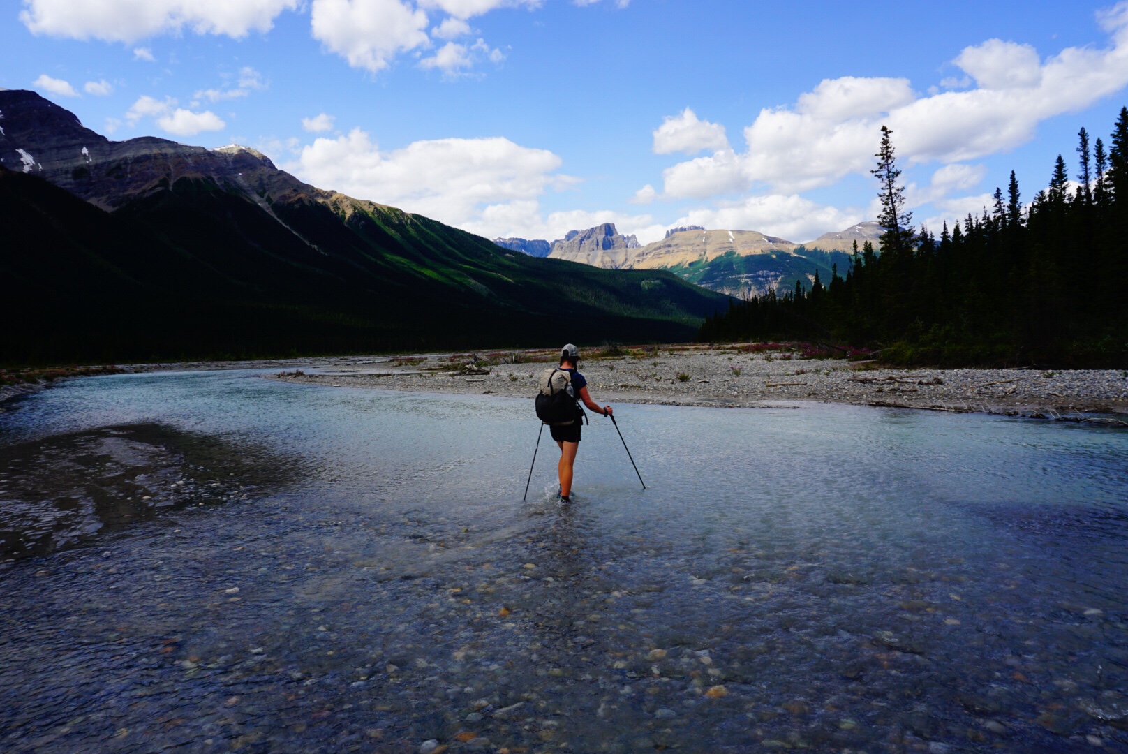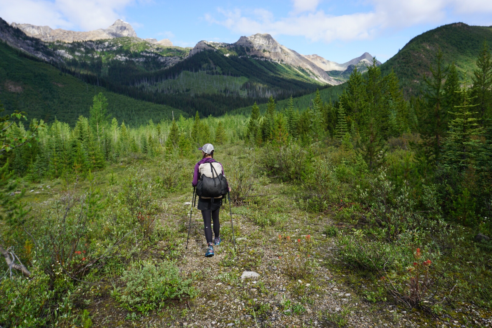 We steadily climbed up to Howse Pass, a historic traffic route that marks the lowest crossing of the Continental Divide in these parts. We won’t cross over into British Columbia and the west side again for another 150 miles. The trail descended to the Howse Flood Plain, a massive, glacially fed valley with the river braiding everywhere. Massive peaks surrounded the valley and for the most part the travel is easy, with some notable exceptions. Sometimes the river channel comes right up to the forest, forcing hikers into some absolutely heinous bushwhacking that at times reduces travel to less than a mile per hour. More than once I wished for my packraft in this section. That’s an idea for future hikers – bring a light little raft and float the Howse to Saskatchewan Crossing!