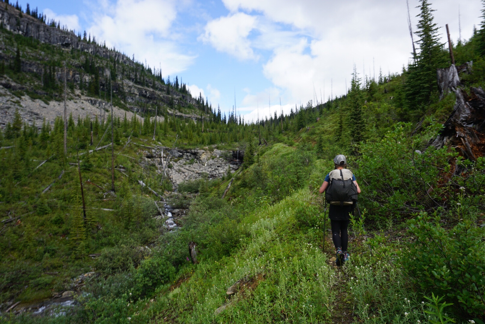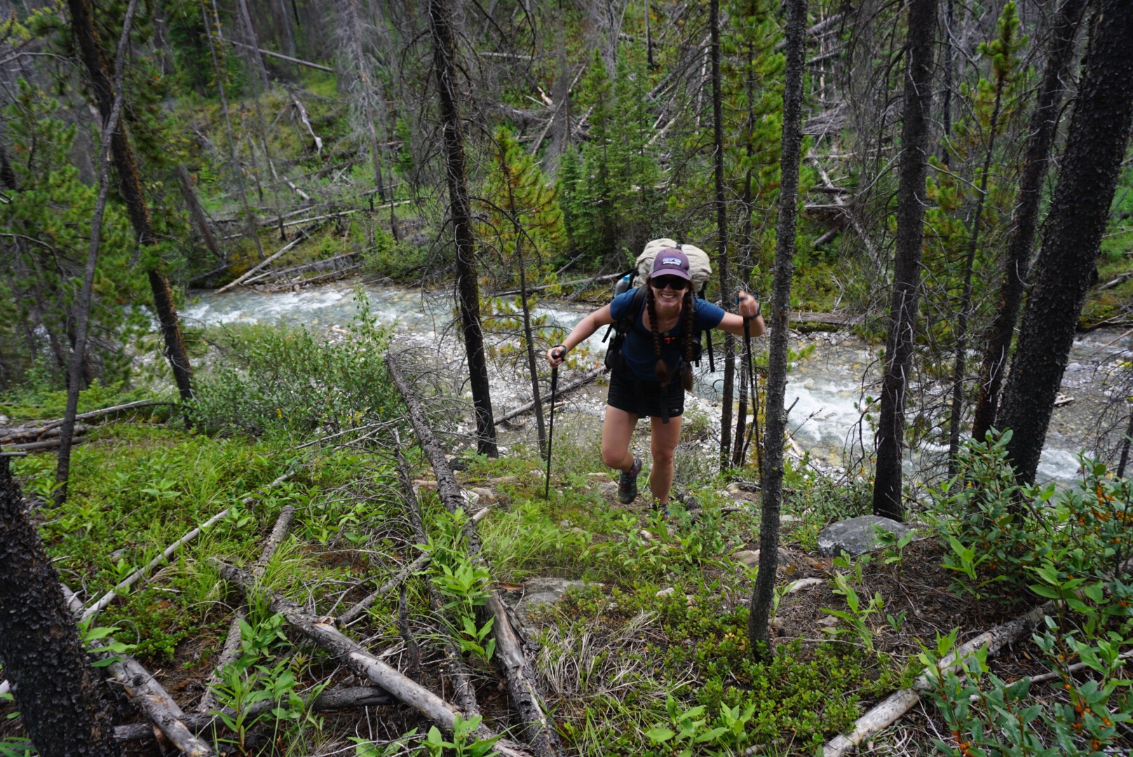 A strange and unique day on the trail. We started off on the David Thompson Trail, came to a river crossing, and happened across a group of four GDT hikers camped on its banks. We exchanged greetings and they seem like a good group of folks. Two of the four are Triple Crowners (having completed the AT, PCT and CDT) named Coyote and Boat. The third in the group, Backtrack, is from Staten Island and has done a lot of adventuring in the northeast including a winter ascent of Katahdin. Rounding out the group is Antoine from France, who we actually saw on day one back at the trailhead near the U.S. border. Hopefully we’ll cross paths again and find out more about them.