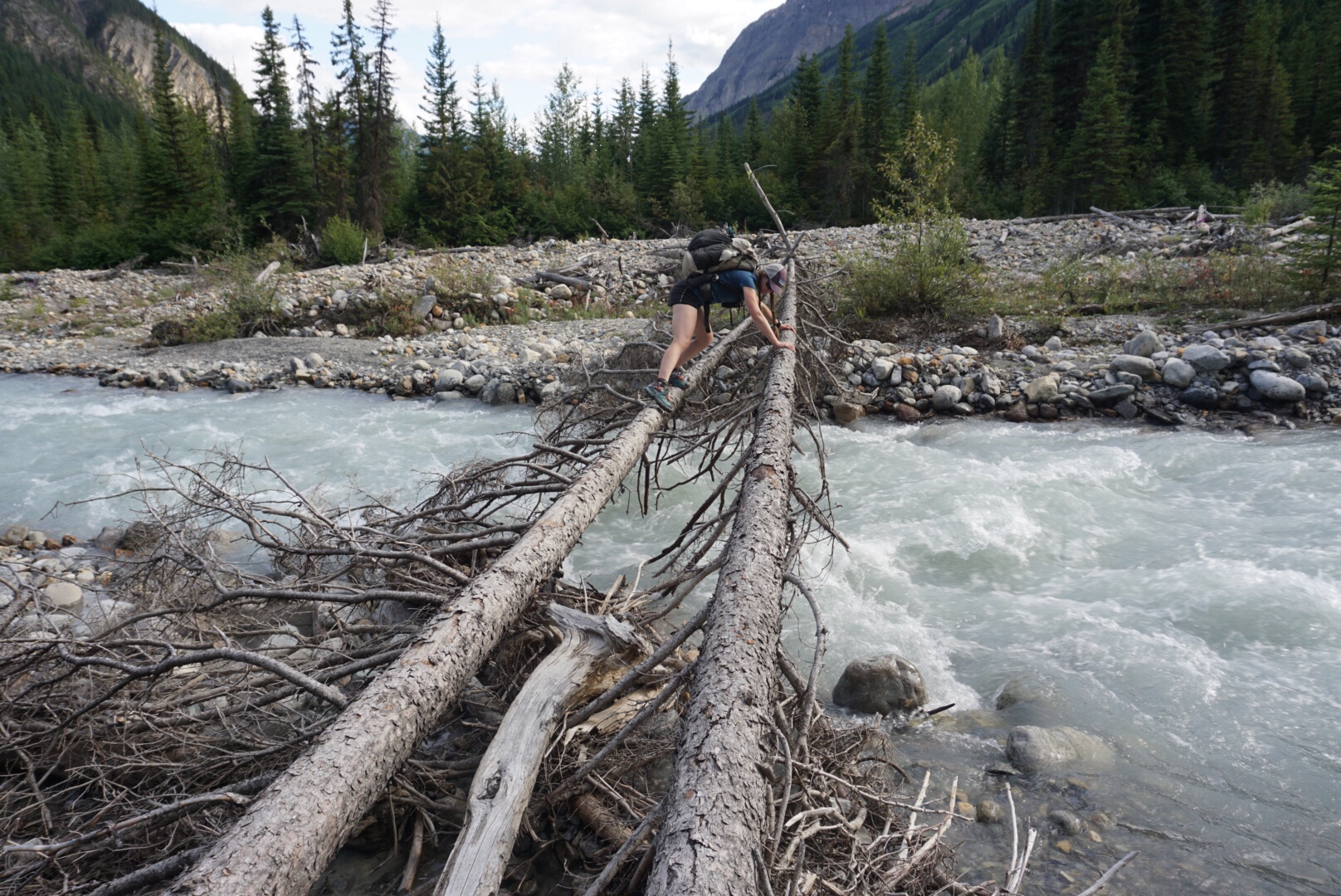 We started the David Thompson Trail which followed directly along the river bed. There was a tricky river crossing with two logs that required a “crawl” technique to get over. Thus far, river crossings on the GDT have been fairly benign, but that promises to change as we move further north. The trail here has been cleared by the Great Divide Trail Association recently, turning what was once a nightmare section into pleasant travel. We set up camp on a nice flat spot along the river, I soaked my improving ankle in its icy, glacial fed waters and we enjoyed the end of a much easier day on the GDT than yesterday.