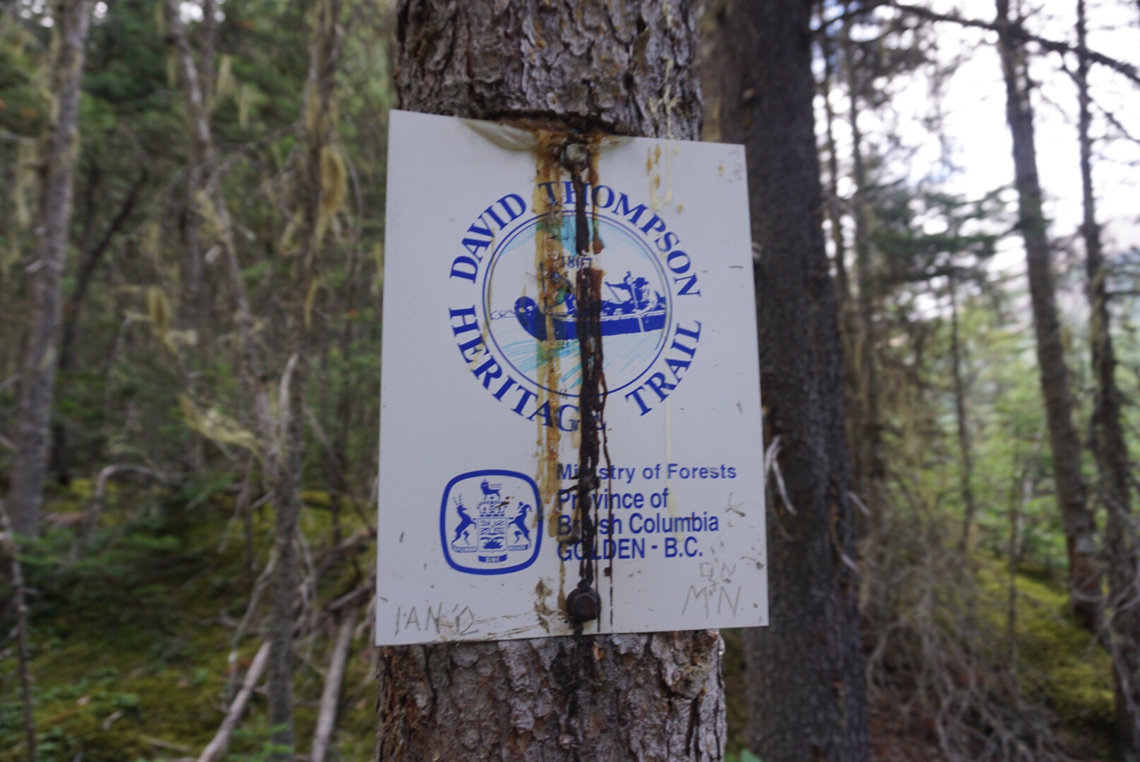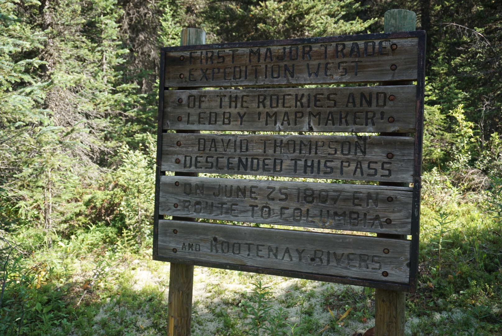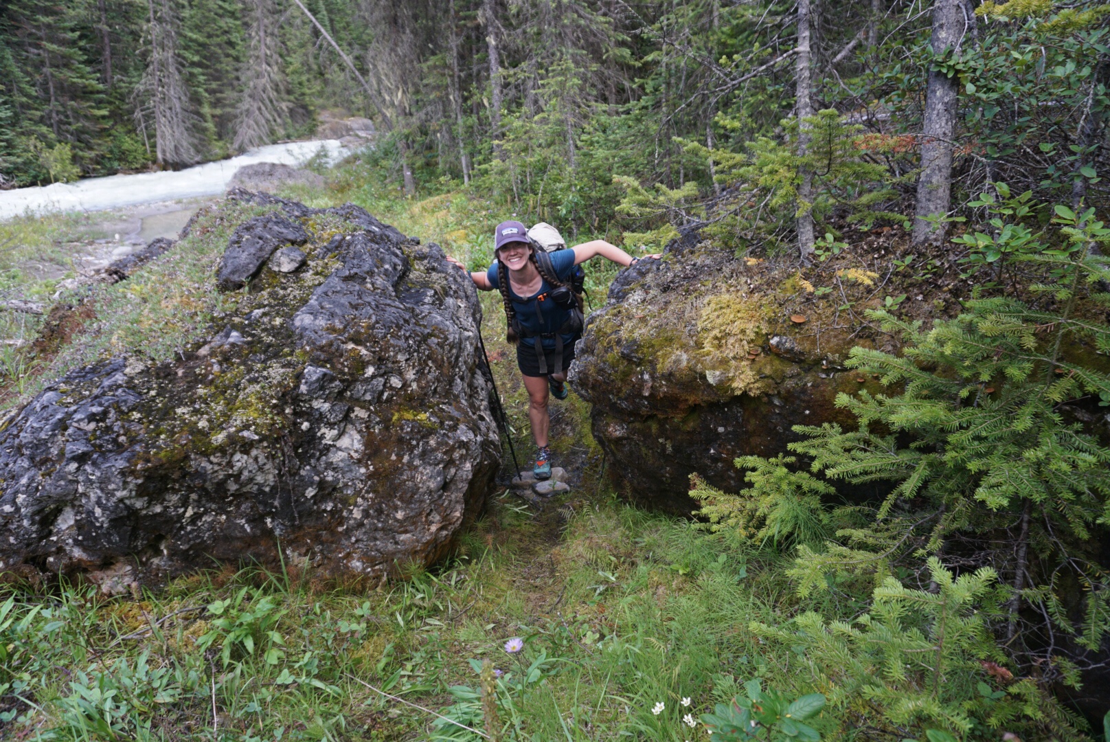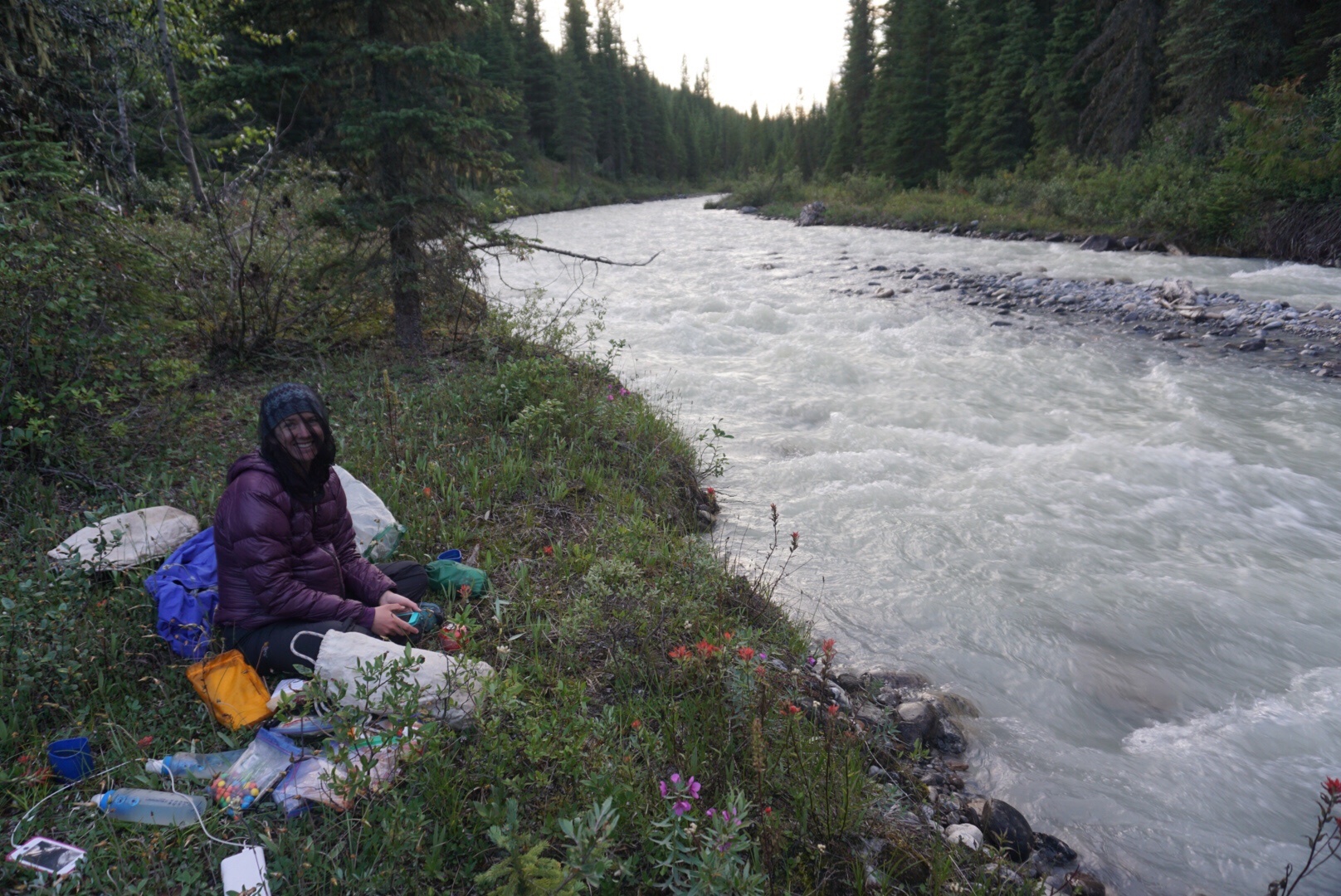 Elaine’s heel began to hurt from the constant wet feet and long descent, so it was with much relief that we finally stopped at the bottom and enjoyed an evening snack along the Blaeberry River. Arriving at the Blaeberry began a portion of our trip that followed a historic trade route in this part of the Canadian Rockies. In 1807 David Thompson explored the area and found a connector from the rivers east of the divide to the Blaeberry, which eventually spills into the Columbia River and the Pacific. It was an important connector for the indigenous people of the area, as well as early trappers and explorers.