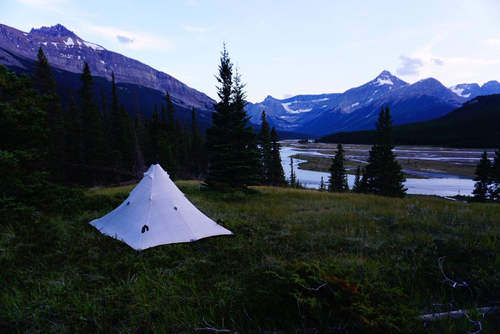 We set up camp at a promontory above the river, away from the biting flies and mosquitoes (mostly). The foursome were nearby so we joined them for dinner while watching the sun set over the Rocky Mountains as the Howse River winds its way through time.